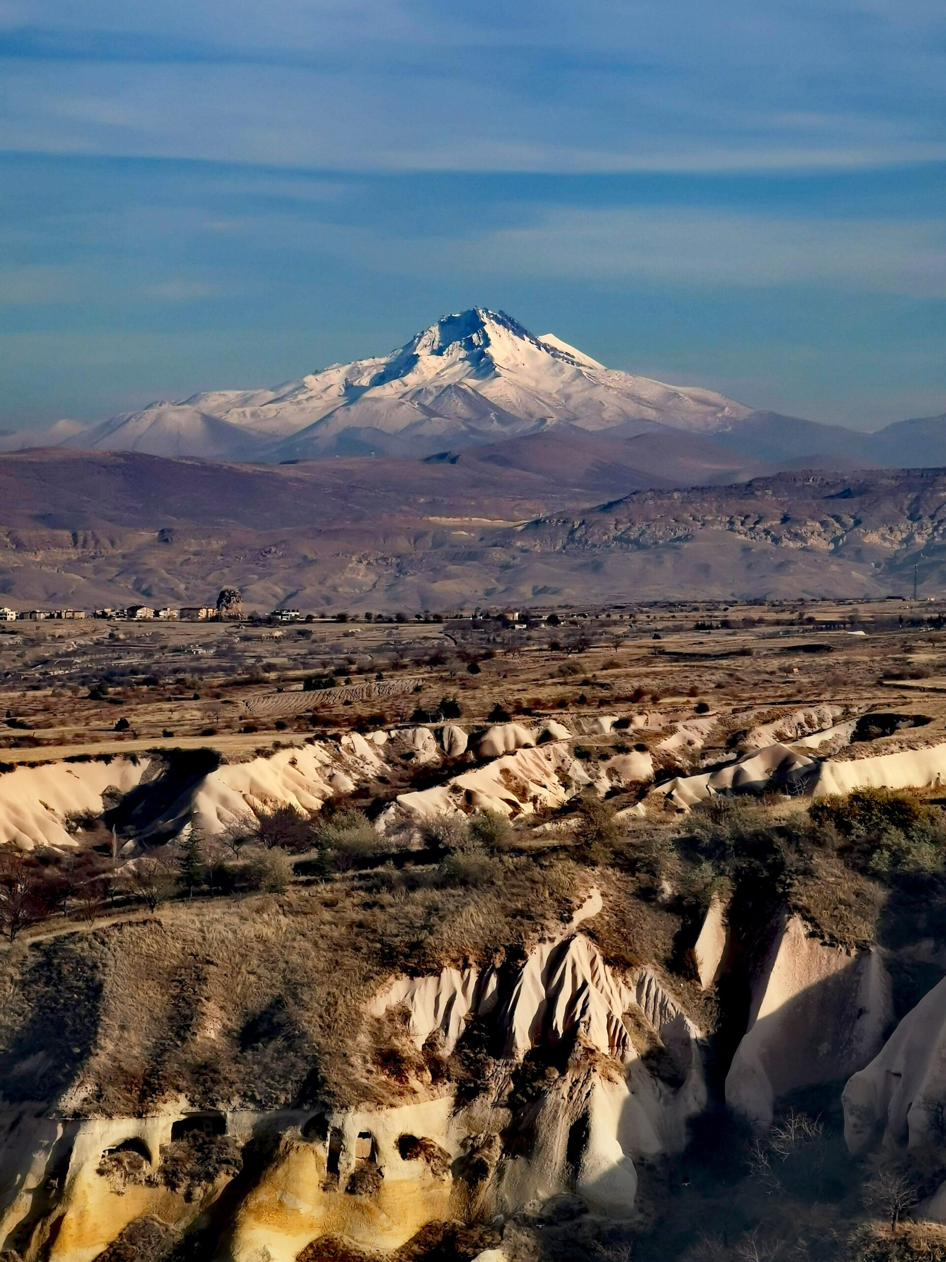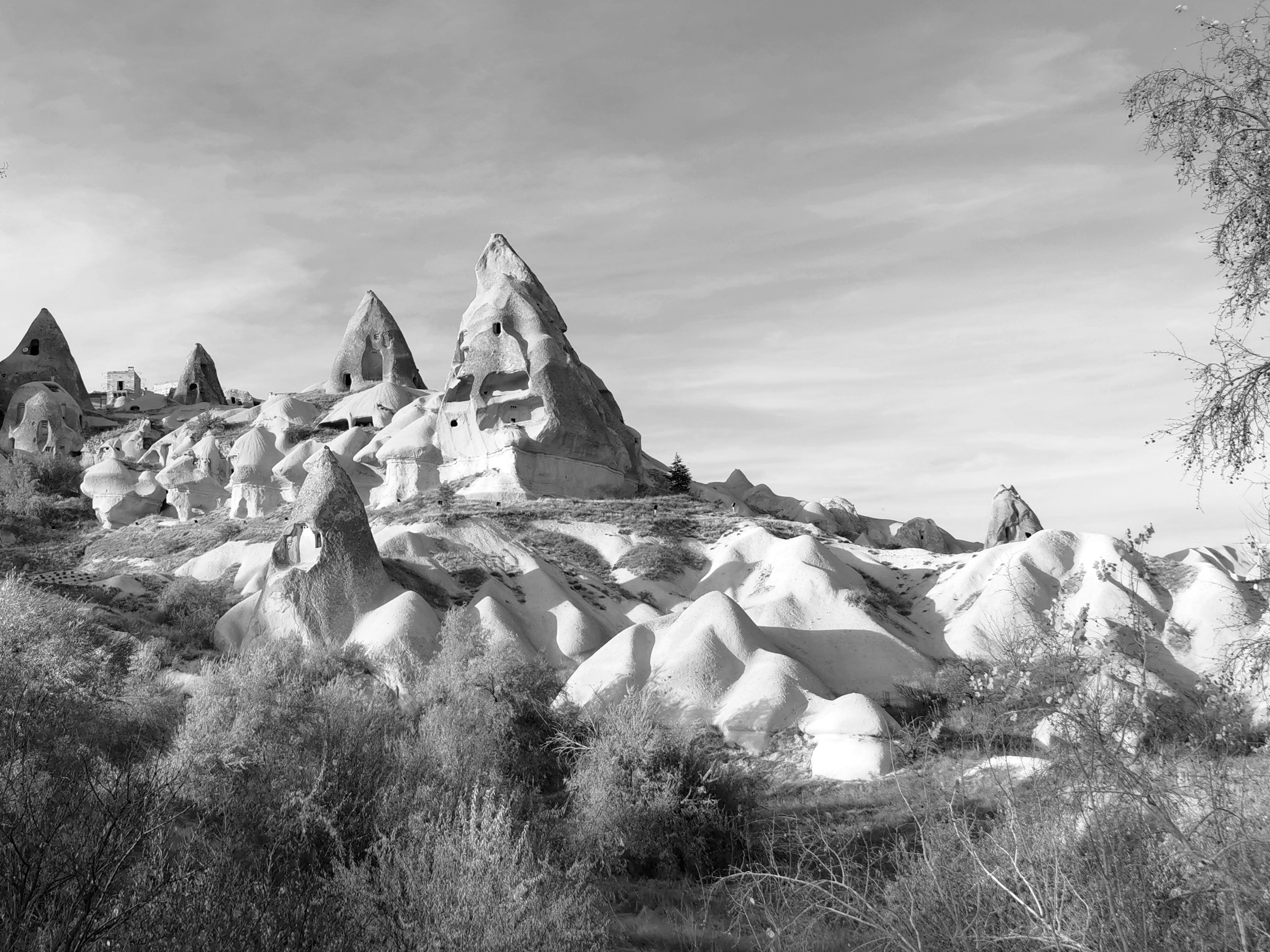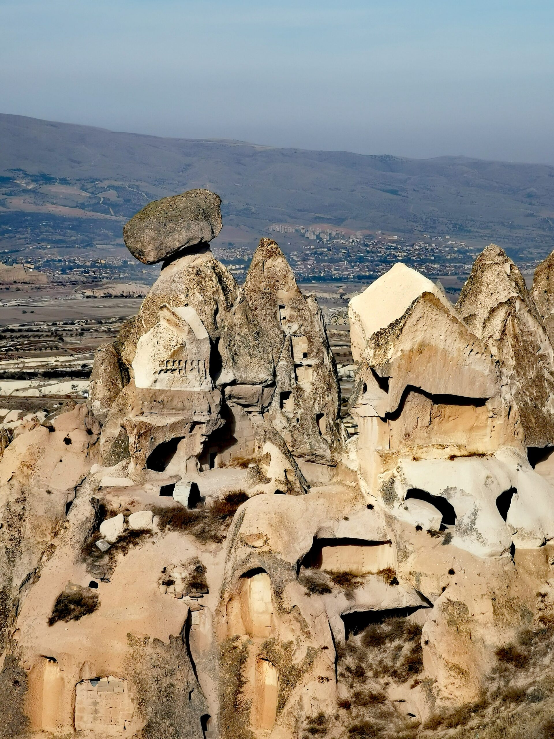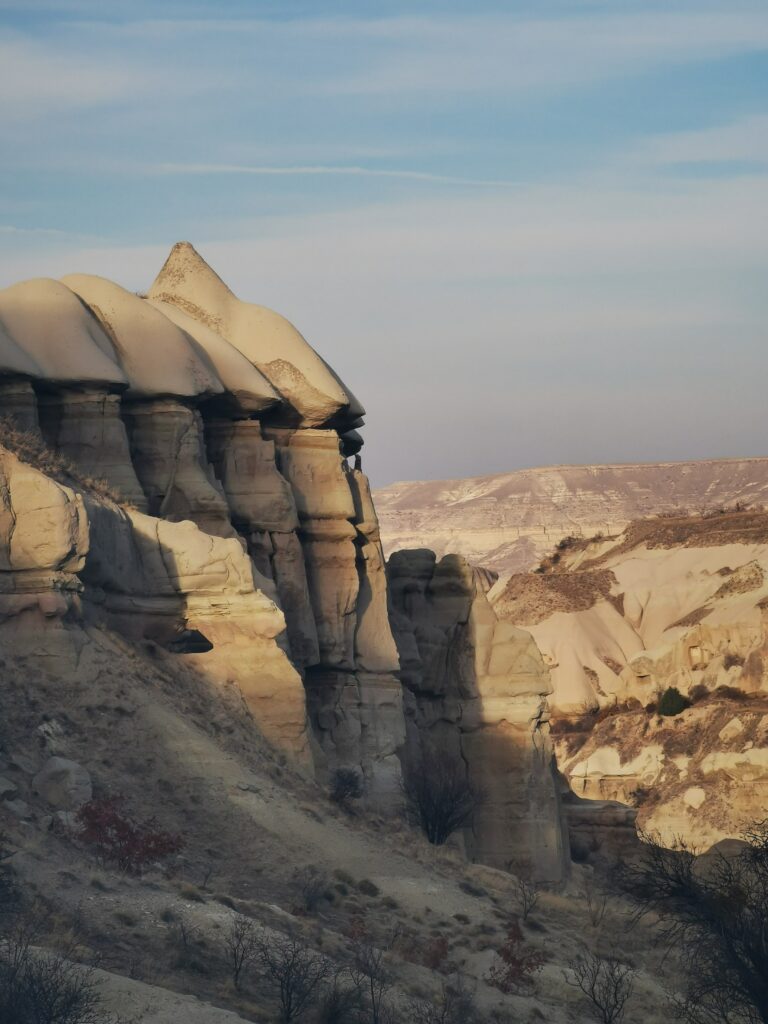 La Cappadoce! Depuis le temps que j’en rêve… Et bien c’est encore plus incroyable et magnifique que ce que j’imaginais!!!! Les villages sont nichés dans des vallées somptueuses où d’innombrables formations rocheuses aux formes et couleurs variées envahissent le paysage. De nombreuses maisons et niches à pigeons sont creusées dans la roche où que se porte le regard. Le Mont Erciyes, paré de sa plus belle robe de neige, pointe à l’horizon. Les hôtels ressemblent à des monuments Greco-Romains ou à des palais troglodytes. Et bien sûr tous les prix sont multipliés par trois! Aujourd’hui, en arrivant, nous posons nos affaires à l’hôtel, prenons un bus pour Uçisar et randonnons dans l’incroyable vallée des pigeons. D’ailleurs, si les hommes creusèrent tant de pigeonniers au douzième siècle, c’était pour inciter les oiseaux à s’installer dans la région et fertiliser de leurs fientes sacrées ces terres arides…