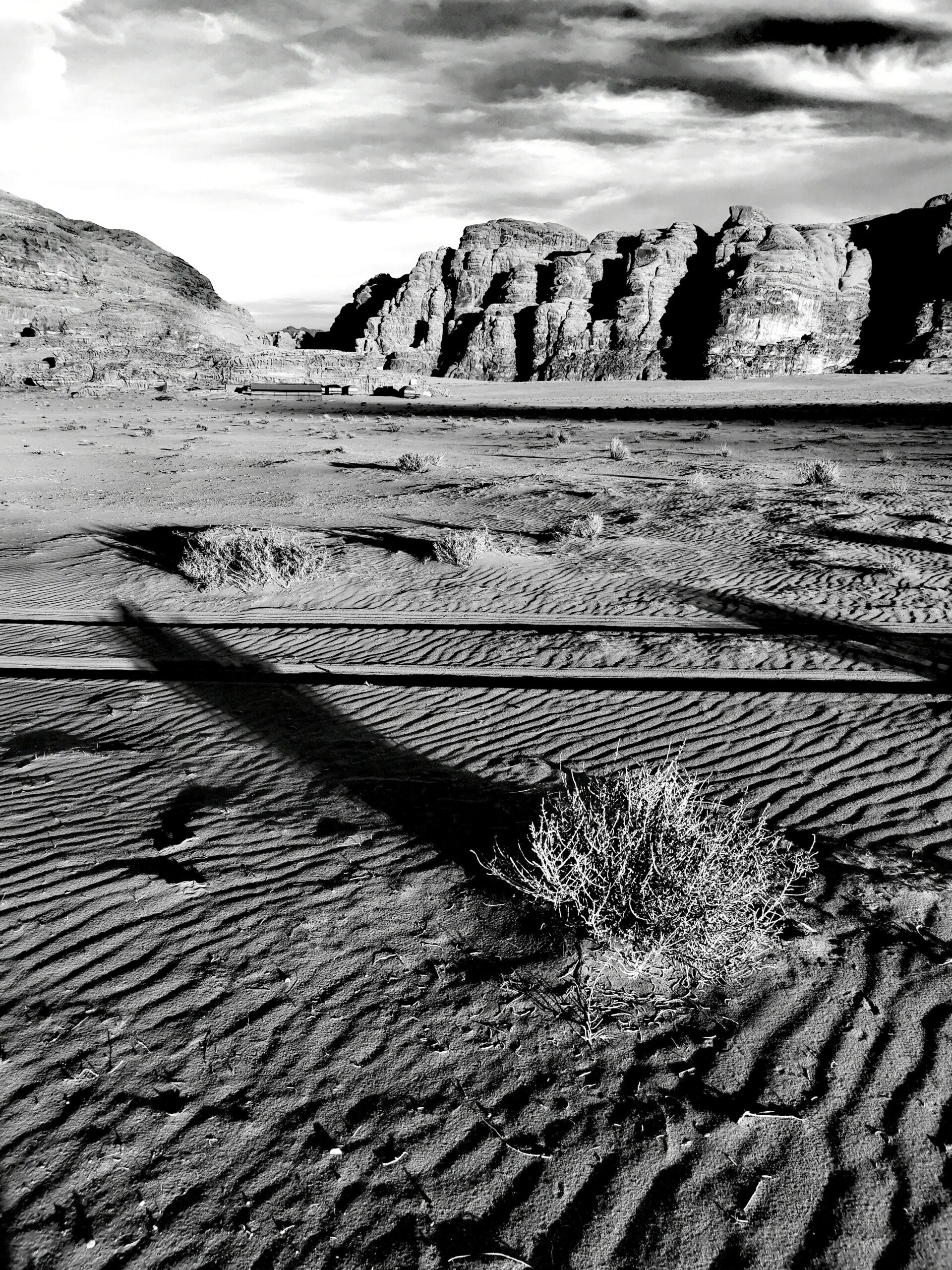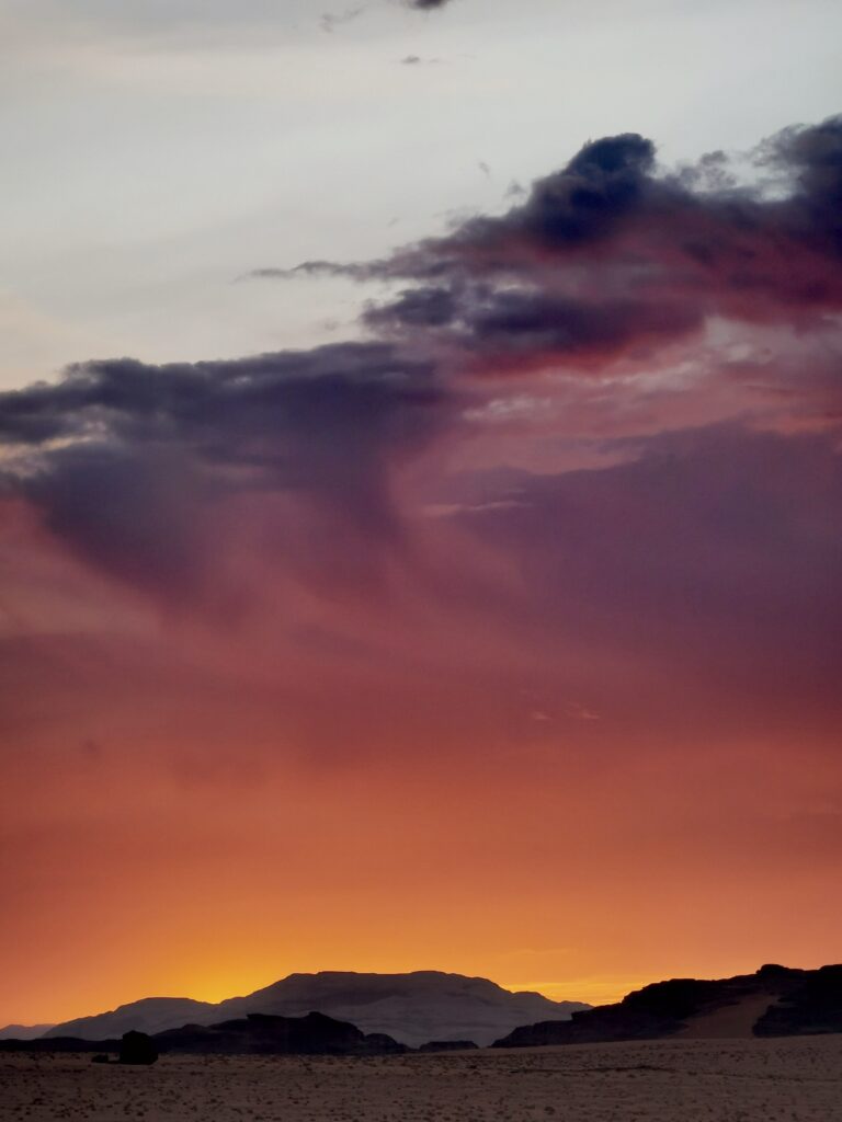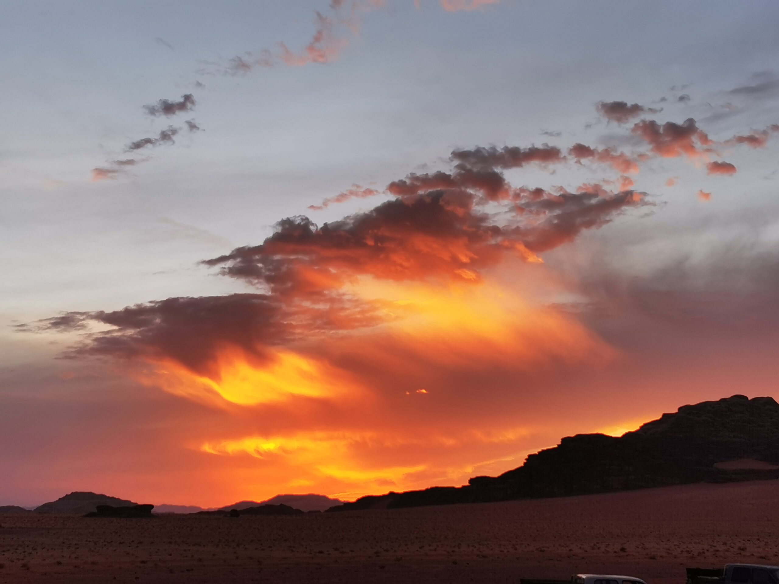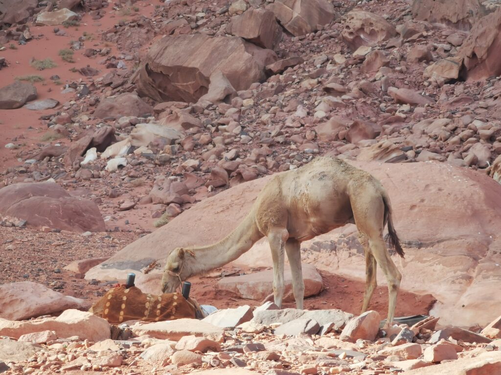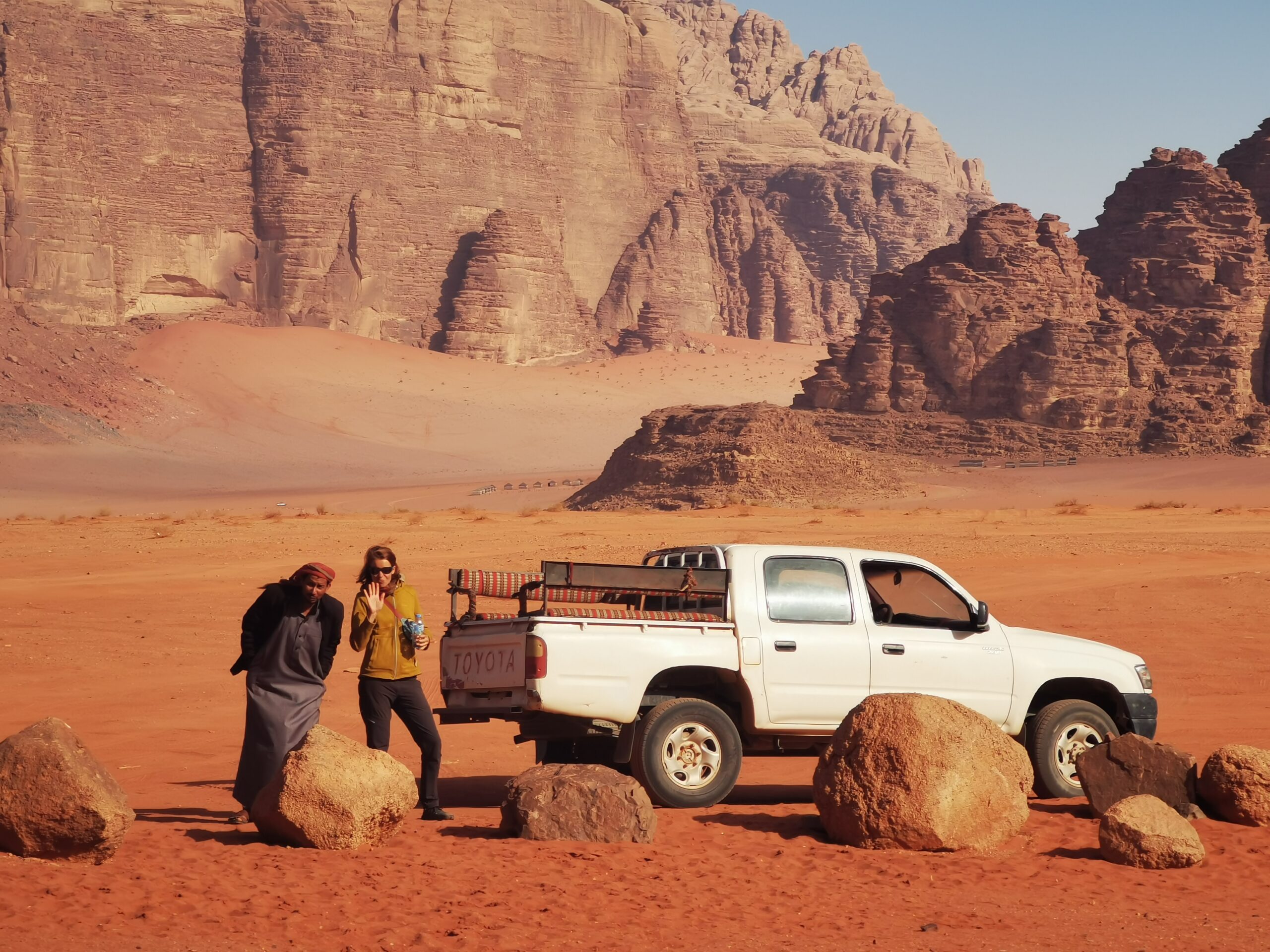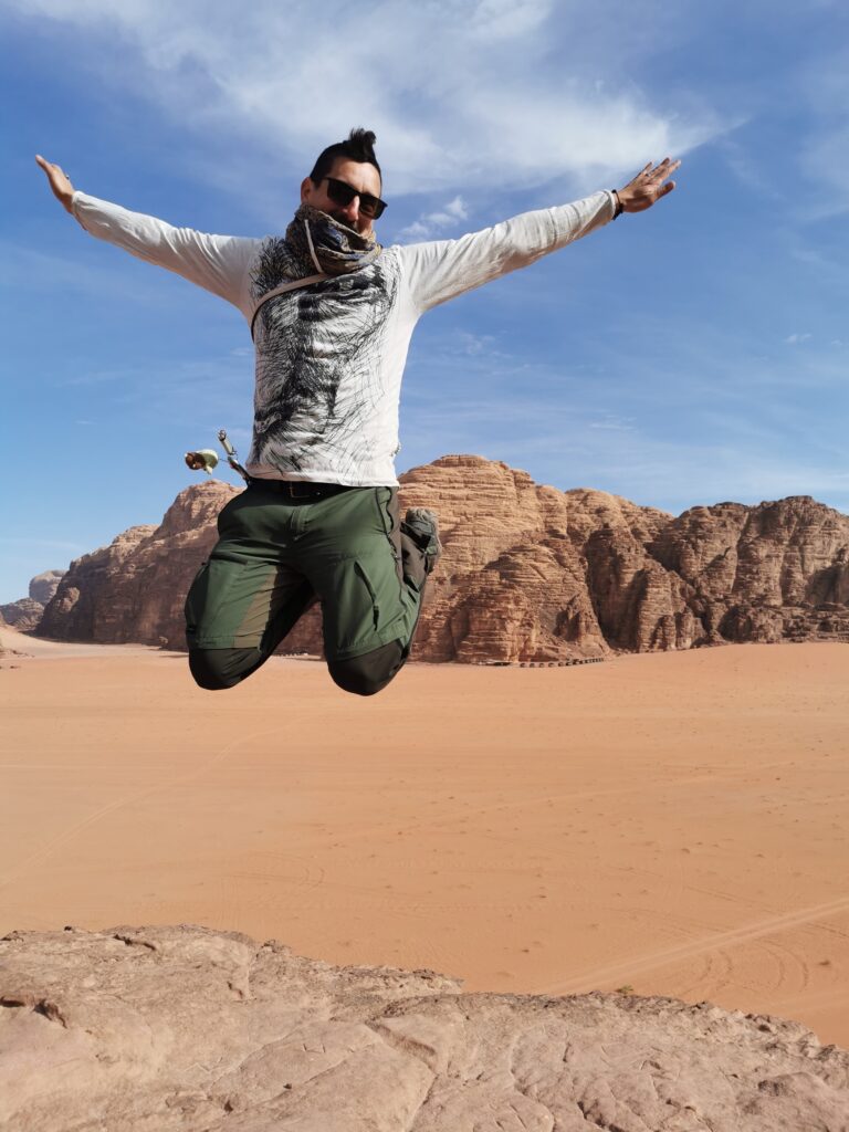 Ce matin nous prenons un bus en direction du Sud du pays où nous attendent les incroyables paysages désertiques/montagneux Du Wadi Rum. Cela fait des années que je rêve de voir ce lieu de mes propres yeux et je n’ai pas été déçu! Une plaine sablonneuse de couleur rouge Mars à 1000m d’altitude d’où s’érigent vers le ciel de nombreuses montagnes (Jbel) jusqu’à 1854m. Et dans ces montagnes on trouve des canyons asséchés, des arches, des falaises vertigineuses, des formes torturées par l’eau (dans le passé) et le vent et des couleurs variées dues aux différentes strates géologiques. Des campements accueillent les touristes, des vieilles jeeps rafistolées et des dromadaires parcourent ce paysage martien et quelques plantes survivent tant bien que mal dans cet univers hostile! Le soir nous mangeons un repas cuit à l’étouffée sous le sable. Et c’est Abdullah qui nous emmène pour un Full Day Trip dans ce décor, qui prend soin de nous, nous sourit, nous cuisine un bon déjeuner sur un feu improvisé, nous prépare du thé et nous rappelle sans cesse “Take your time!”. Le coucher de soleil est flamboyant puis la nuit étincelle d’étoiles alors que le désert s’illumine sous une lune bientôt pleine…