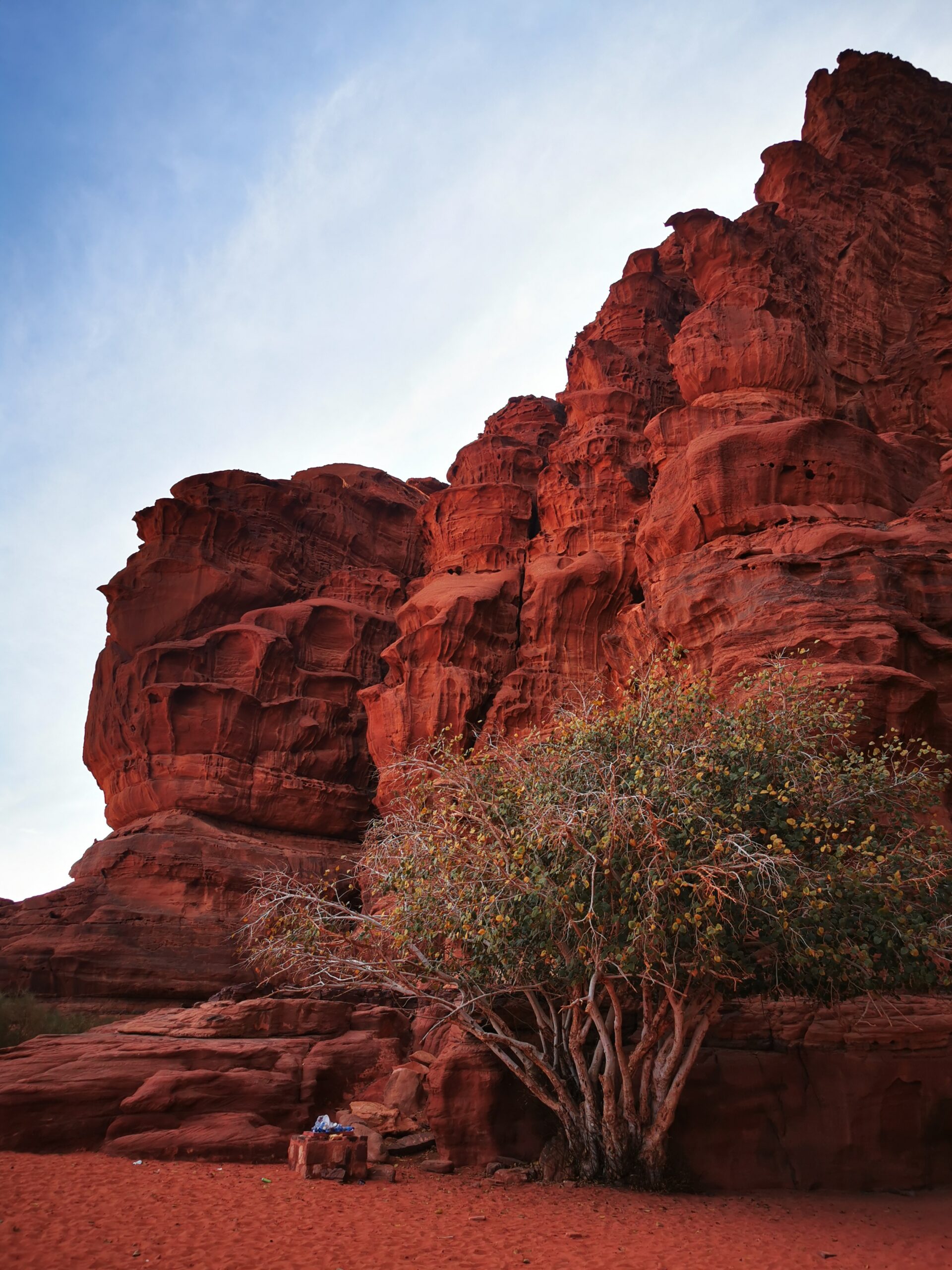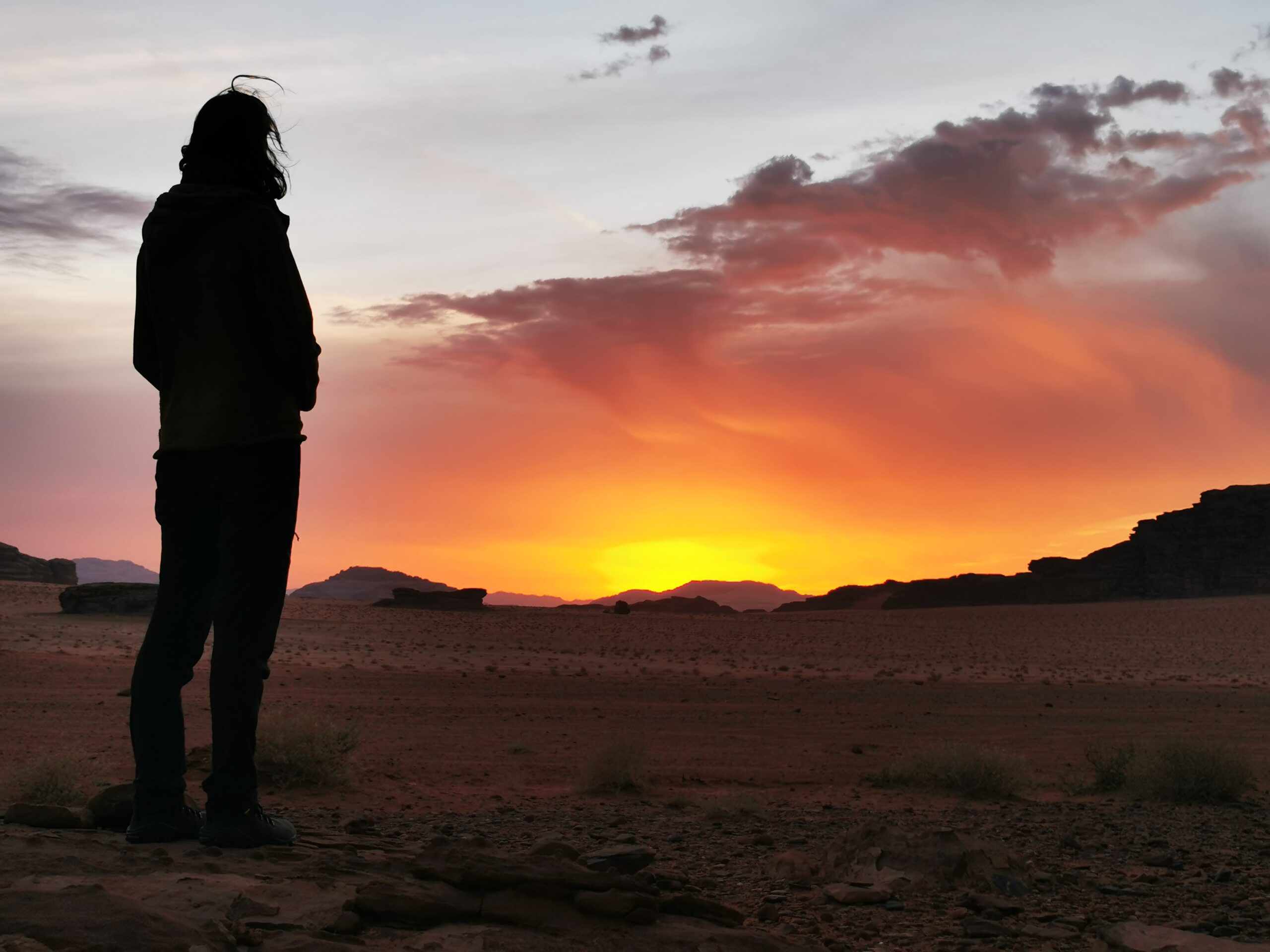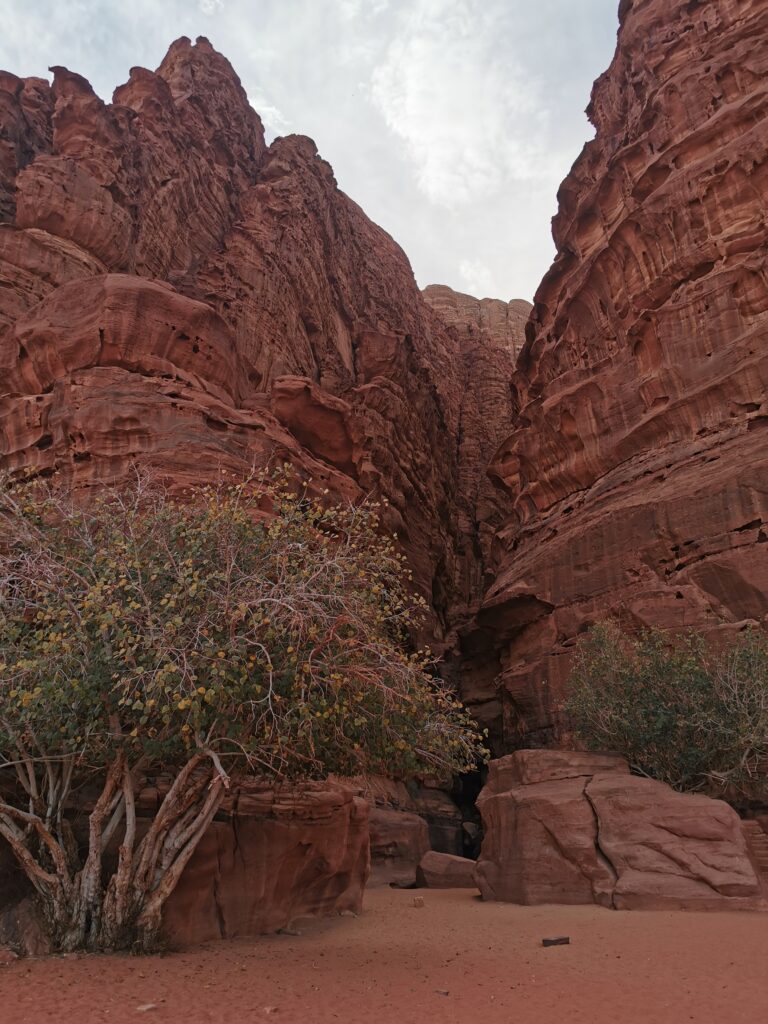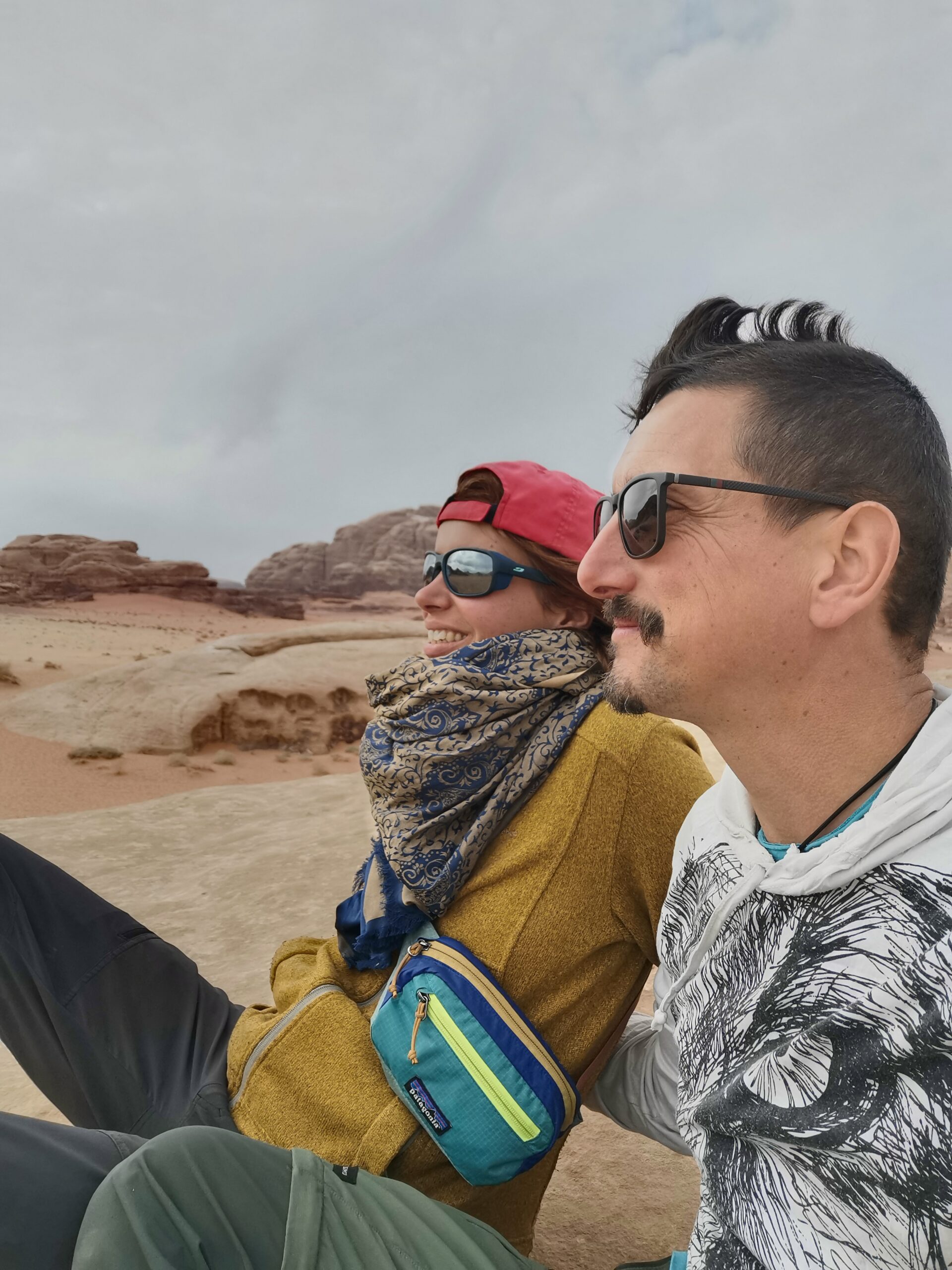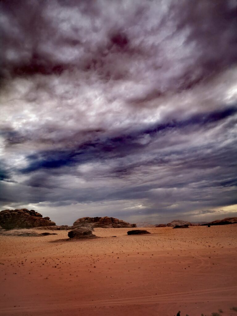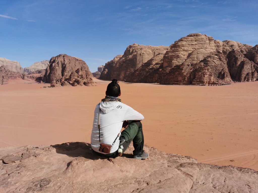 Ce matin nous prenons un bus en direction du Sud du pays où nous attendent les incroyables paysages désertiques/montagneux Du Wadi Rum. Cela fait des années que je rêve de voir ce lieu de mes propres yeux et je n’ai pas été déçu! Une plaine sablonneuse de couleur rouge Mars à 1000m d’altitude d’où s’érigent vers le ciel de nombreuses montagnes (Jbel) jusqu’à 1854m. Et dans ces montagnes on trouve des canyons asséchés, des arches, des falaises vertigineuses, des formes torturées par l’eau (dans le passé) et le vent et des couleurs variées dues aux différentes strates géologiques. Des campements accueillent les touristes, des vieilles jeeps rafistolées et des dromadaires parcourent ce paysage martien et quelques plantes survivent tant bien que mal dans cet univers hostile! Le soir nous mangeons un repas cuit à l’étouffée sous le sable. Et c’est Abdullah qui nous emmène pour un Full Day Trip dans ce décor, qui prend soin de nous, nous sourit, nous cuisine un bon déjeuner sur un feu improvisé, nous prépare du thé et nous rappelle sans cesse “Take your time!”. Le coucher de soleil est flamboyant puis la nuit étincelle d’étoiles alors que le désert s’illumine sous une lune bientôt pleine…
