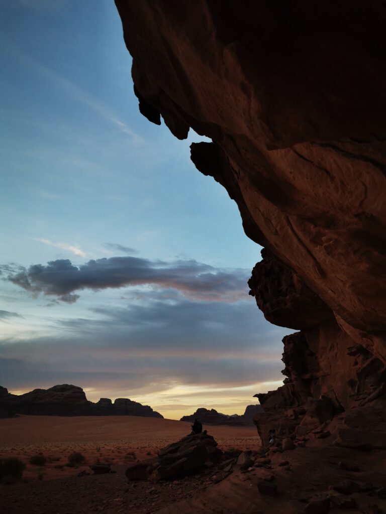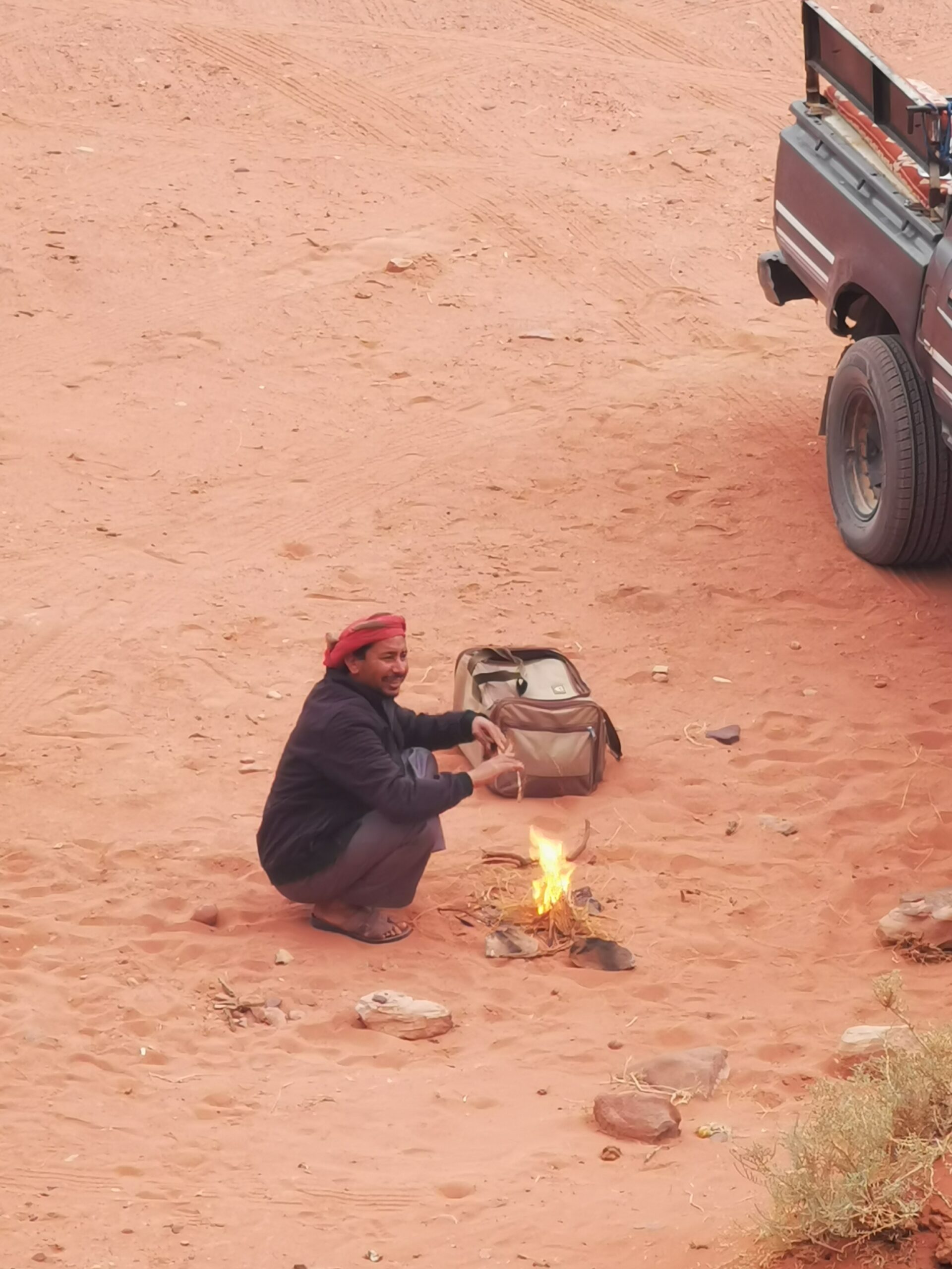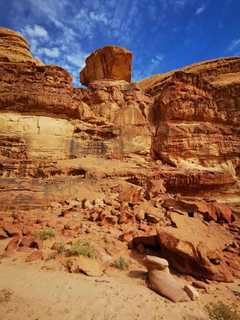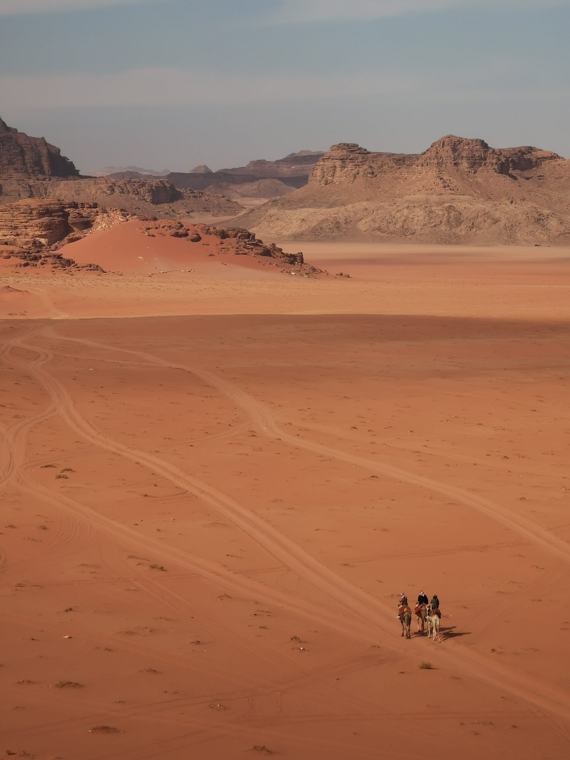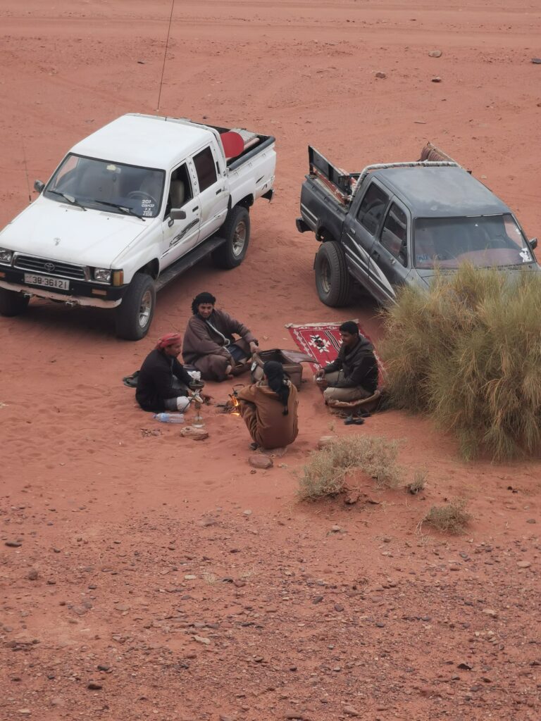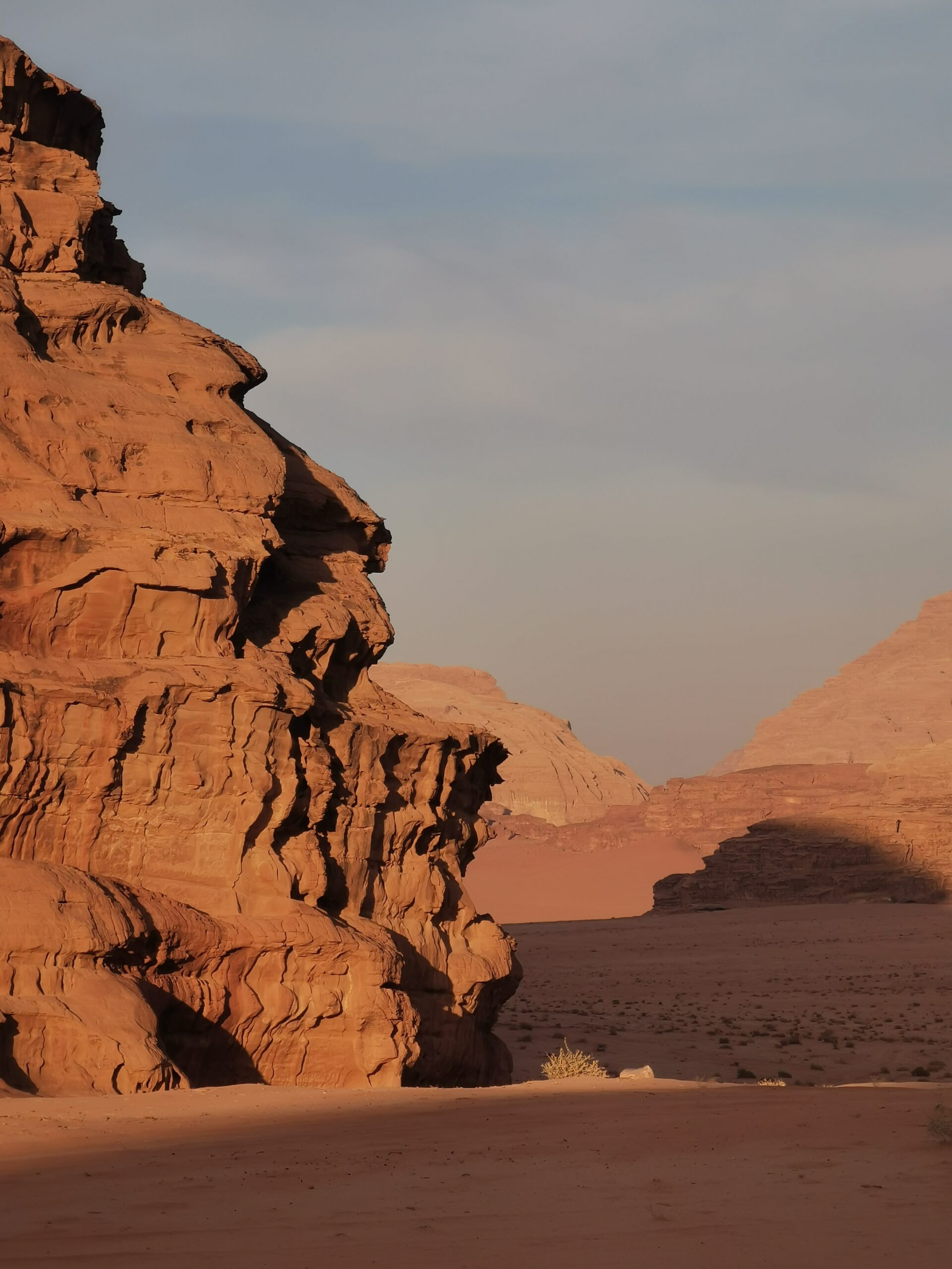 Ce matin nous prenons un bus en direction du Sud du pays où nous attendent les incroyables paysages désertiques/montagneux Du Wadi Rum. Cela fait des années que je rêve de voir ce lieu de mes propres yeux et je n’ai pas été déçu! Une plaine sablonneuse de couleur rouge Mars à 1000m d’altitude d’où s’érigent vers le ciel de nombreuses montagnes (Jbel) jusqu’à 1854m. Et dans ces montagnes on trouve des canyons asséchés, des arches, des falaises vertigineuses, des formes torturées par l’eau (dans le passé) et le vent et des couleurs variées dues aux différentes strates géologiques. Des campements accueillent les touristes, des vieilles jeeps rafistolées et des dromadaires parcourent ce paysage martien et quelques plantes survivent tant bien que mal dans cet univers hostile! Le soir nous mangeons un repas cuit à l’étouffée sous le sable. Et c’est Abdullah qui nous emmène pour un Full Day Trip dans ce décor, qui prend soin de nous, nous sourit, nous cuisine un bon déjeuner sur un feu improvisé, nous prépare du thé et nous rappelle sans cesse “Take your time!”. Le coucher de soleil est flamboyant puis la nuit étincelle d’étoiles alors que le désert s’illumine sous une lune bientôt pleine…