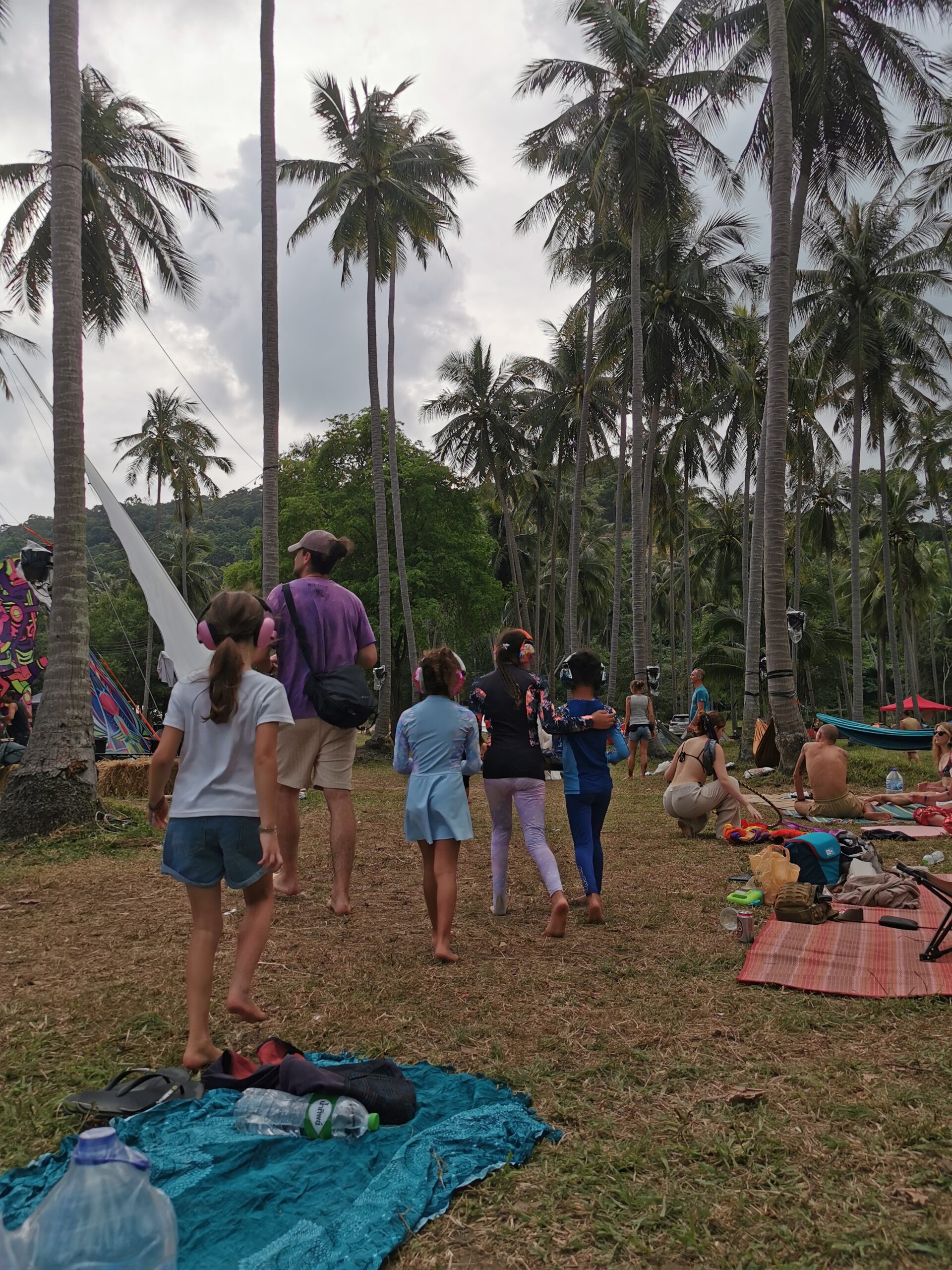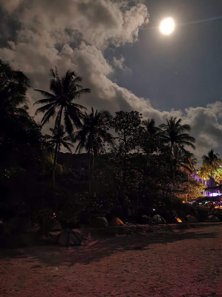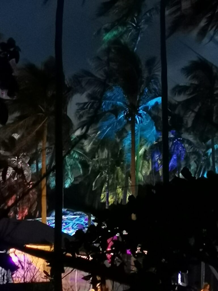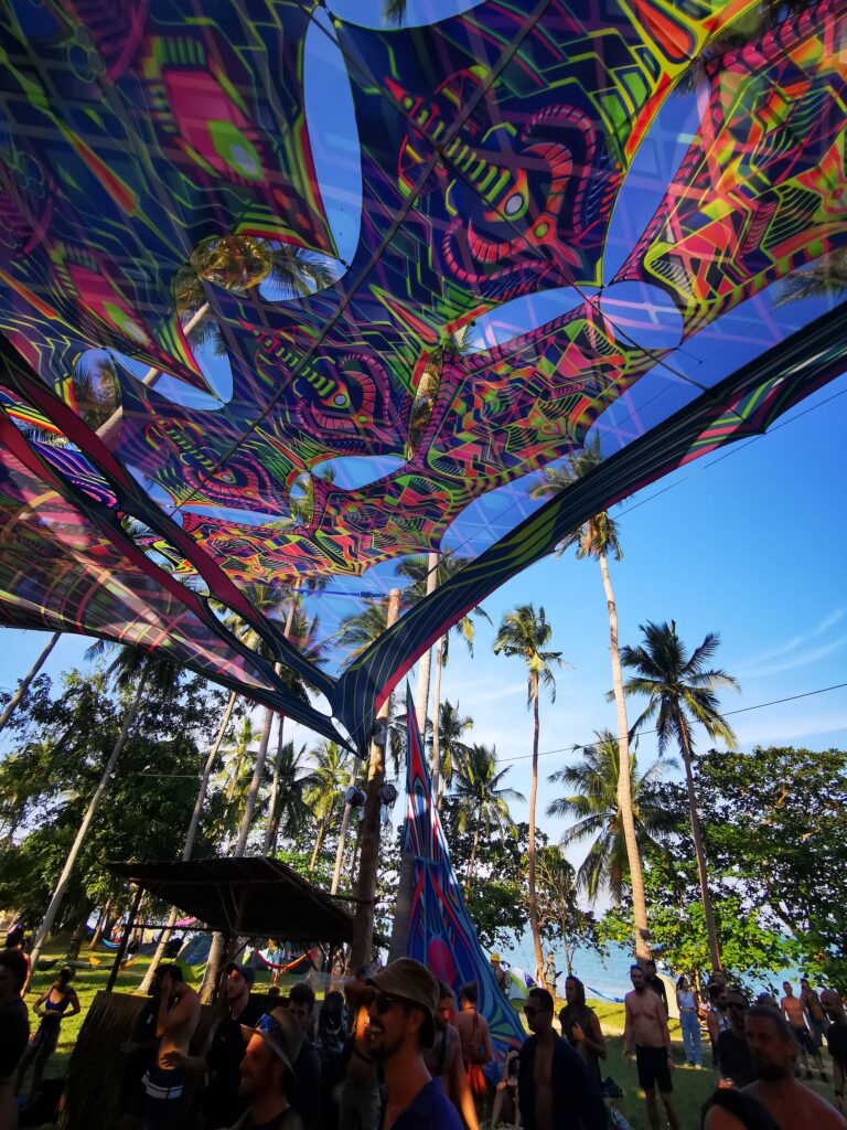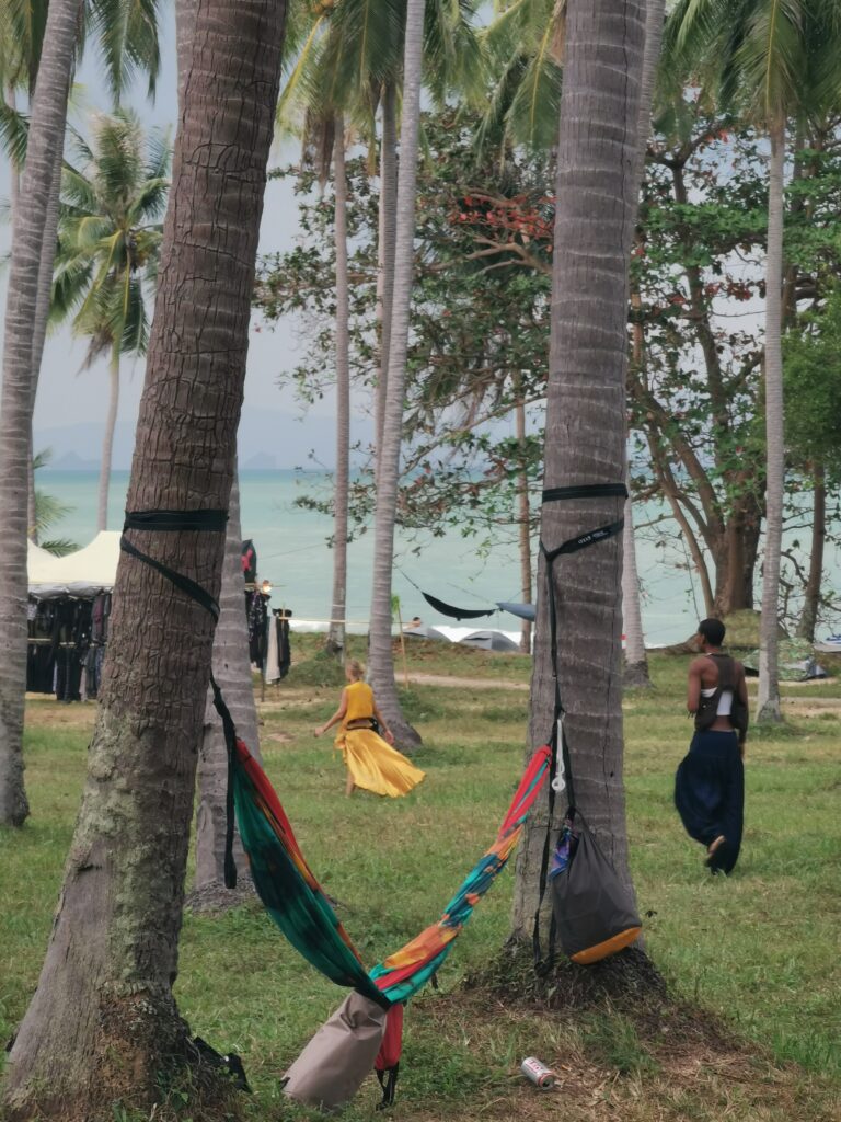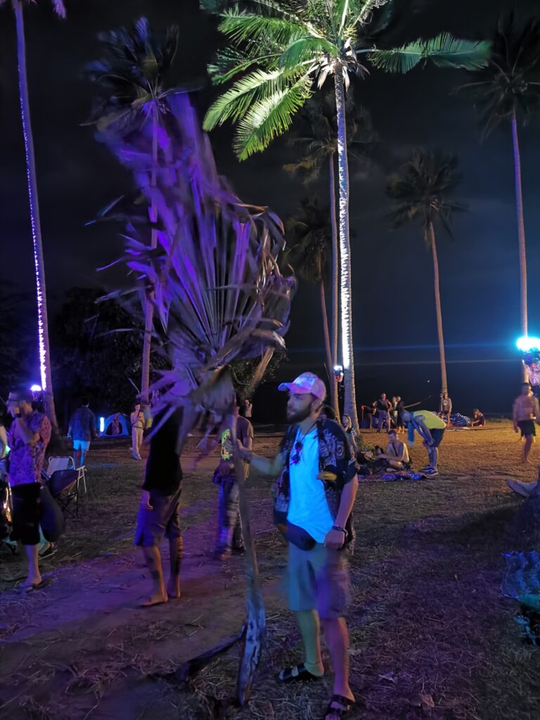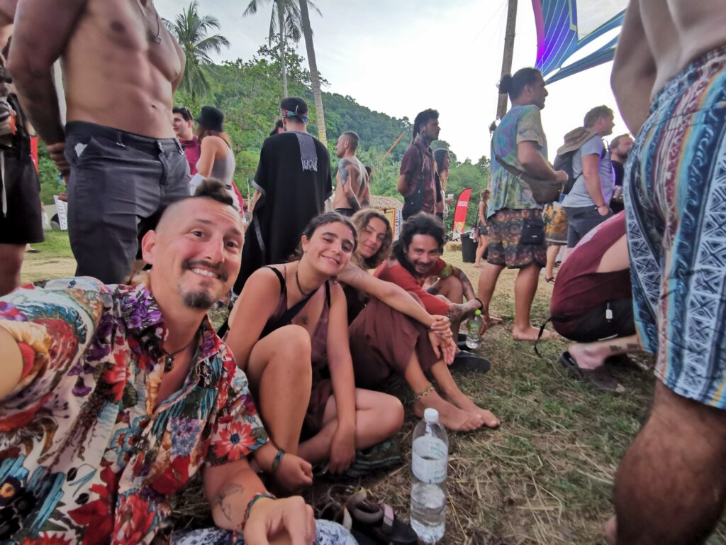 Je la retrouve donc le lendemain ainsi que Sara, une maroco germano irlandaise qu’elle avait rencontrée quelques semaines plus tôt et Nico un italien que Sara a rencontré la veille. Et on y a aussi rencontré notre voisin de campement Fabio (don’t j’ai oublié l’origine exacte mais d’Amérique du Sud). Nous y avons passé une semaine magique de danse, de plage, de chill, de rigolades, de partage d’expérience de voyage et de bonnes bouffes au petit resto au bout de la plage. Ce restaurant familial était notre petit havre de paix loin des basses chaque soir pour le dîner. Le site du festival est très beau avec des palmiers, la plage turquoise et la scène psychédélique. La plage était jonchée de détritus et Je pense qu’au moins la moitié des festivaliers, un moment où un autre, à pris un sac poubelle pour nettoyer un bout de la plage. À la fin de la semaine elle était presque nickel! Puis la grande marée de la pleine Lune à tout recouvert de plastique à nouveau… On a bien déconné avec la Planète… Pour ne pas finir sur une note négative, cette semaine était vraiment très chouette et m’a donné plein d’énergie pour la suite! Et dormir en tente sans climatisation pendant une semaine m’a permis de réellement m’habituer à la chaleur! Maintenant en route pour Bangkok où je rejoins ma sœur Sandra, mon beau-frère Loran et mon neveu Barnabé pour quelques jours!