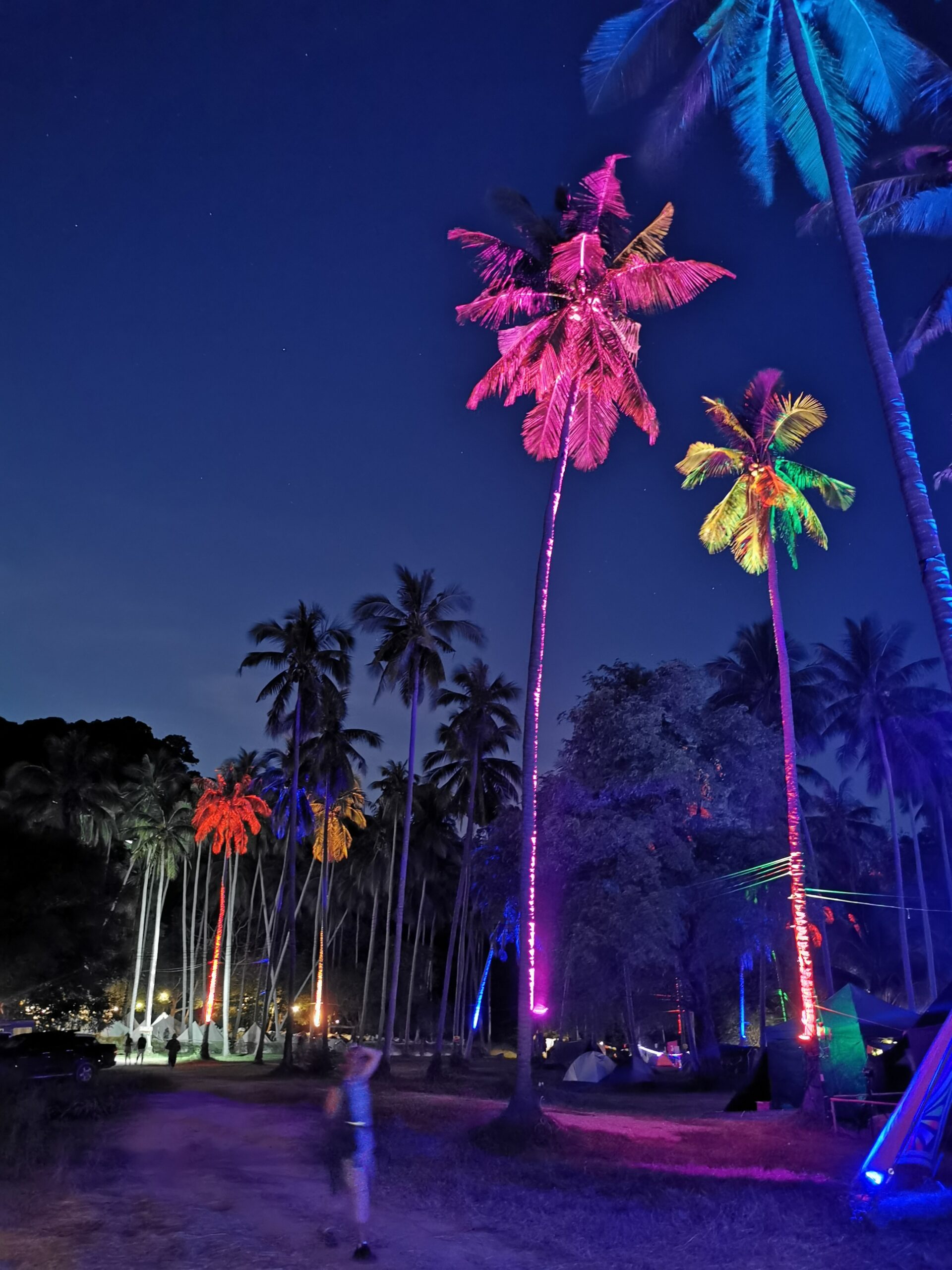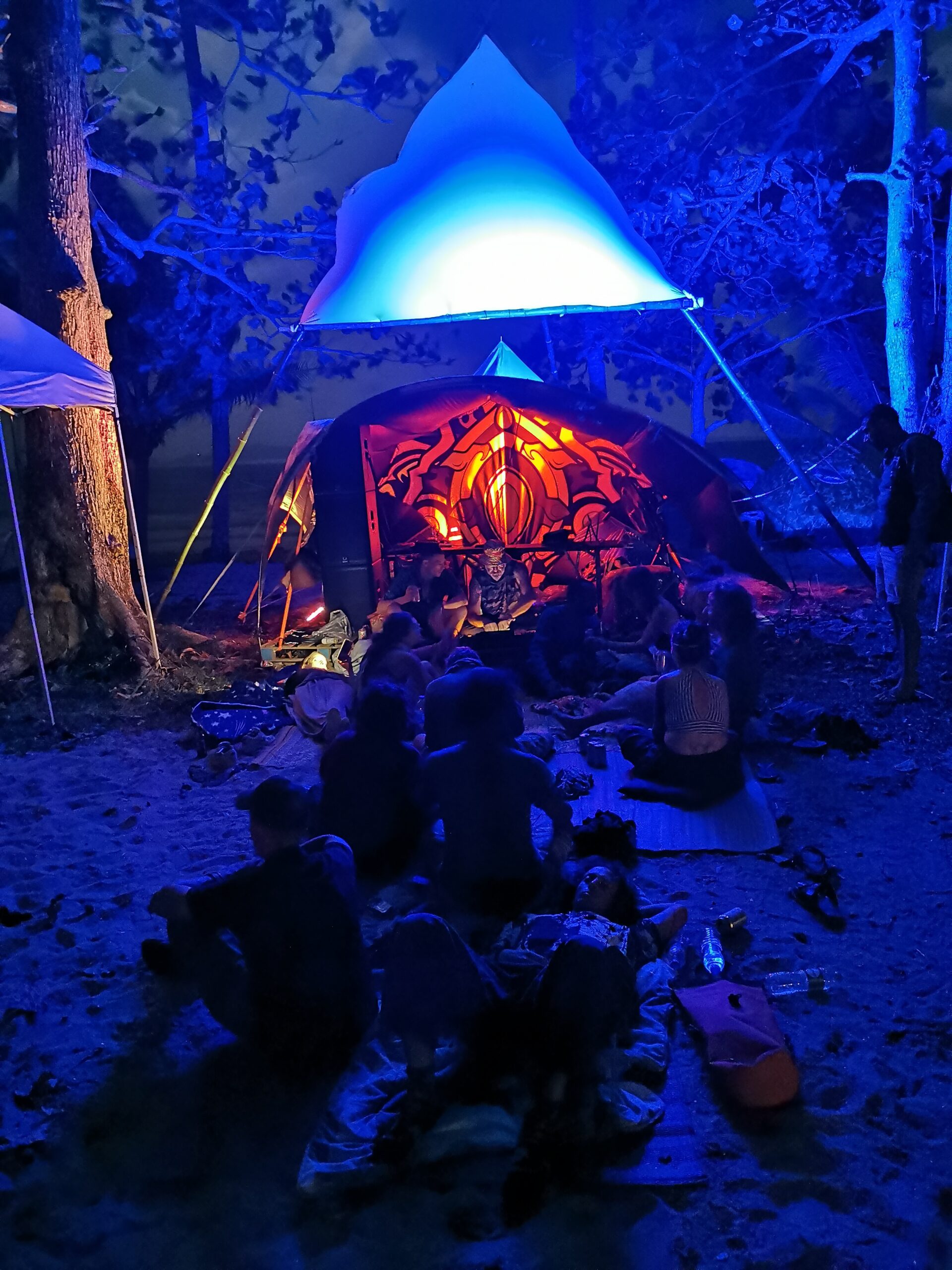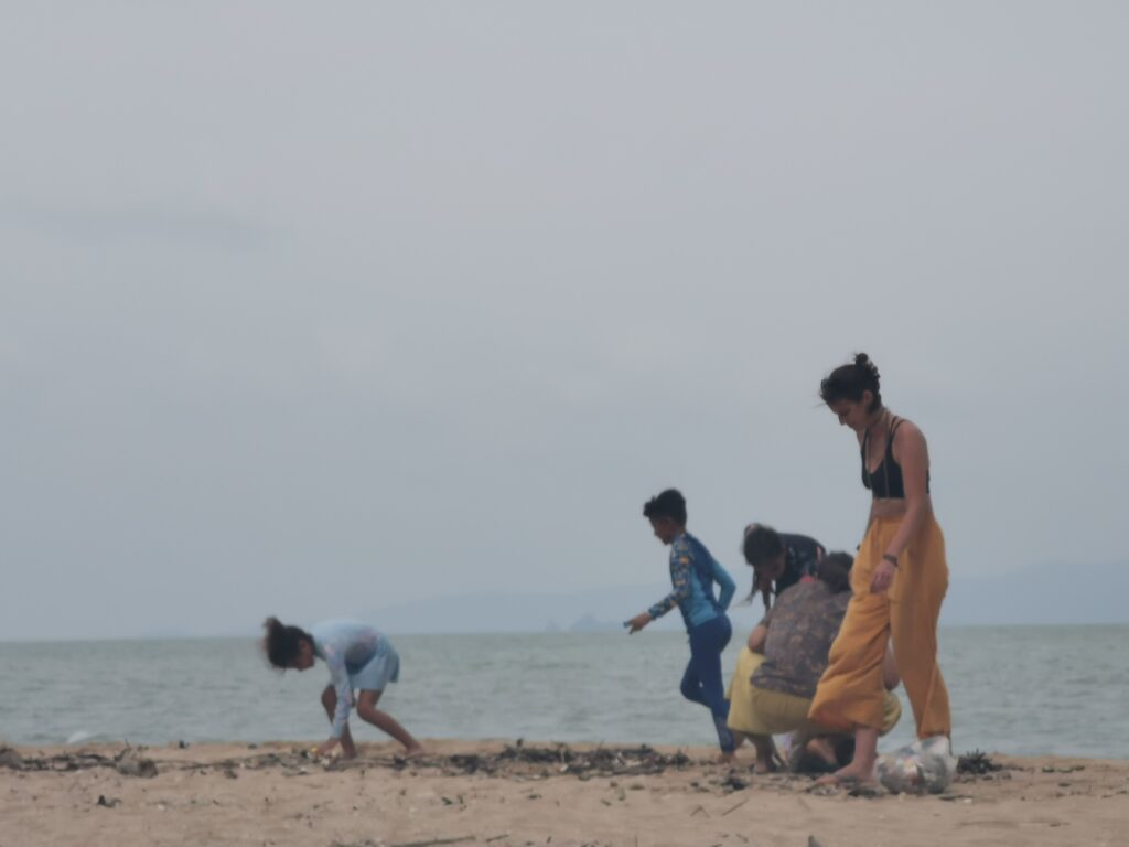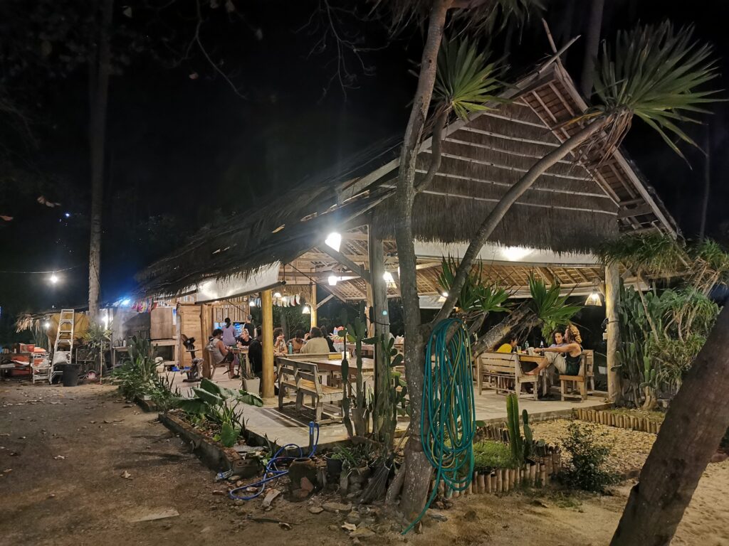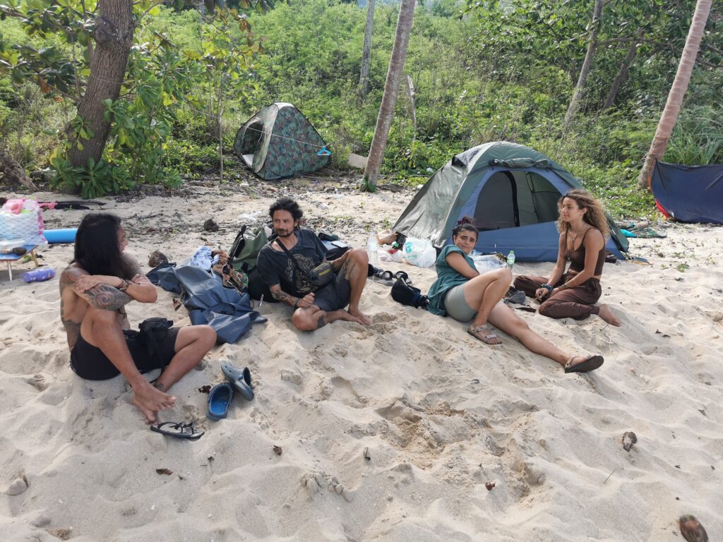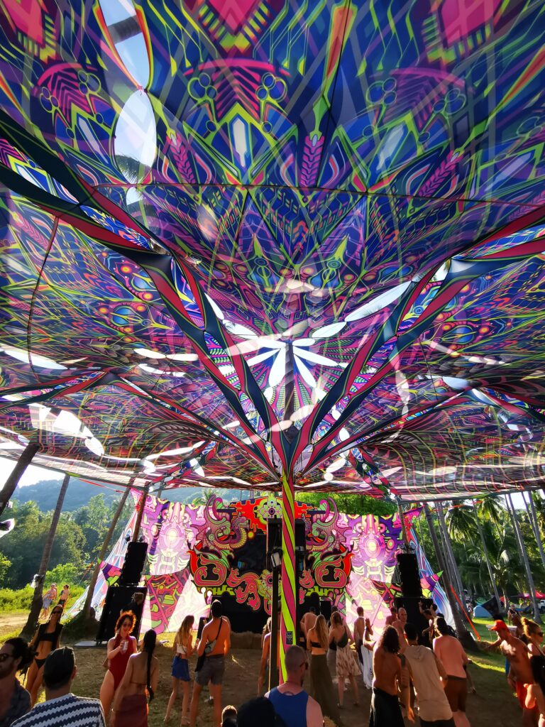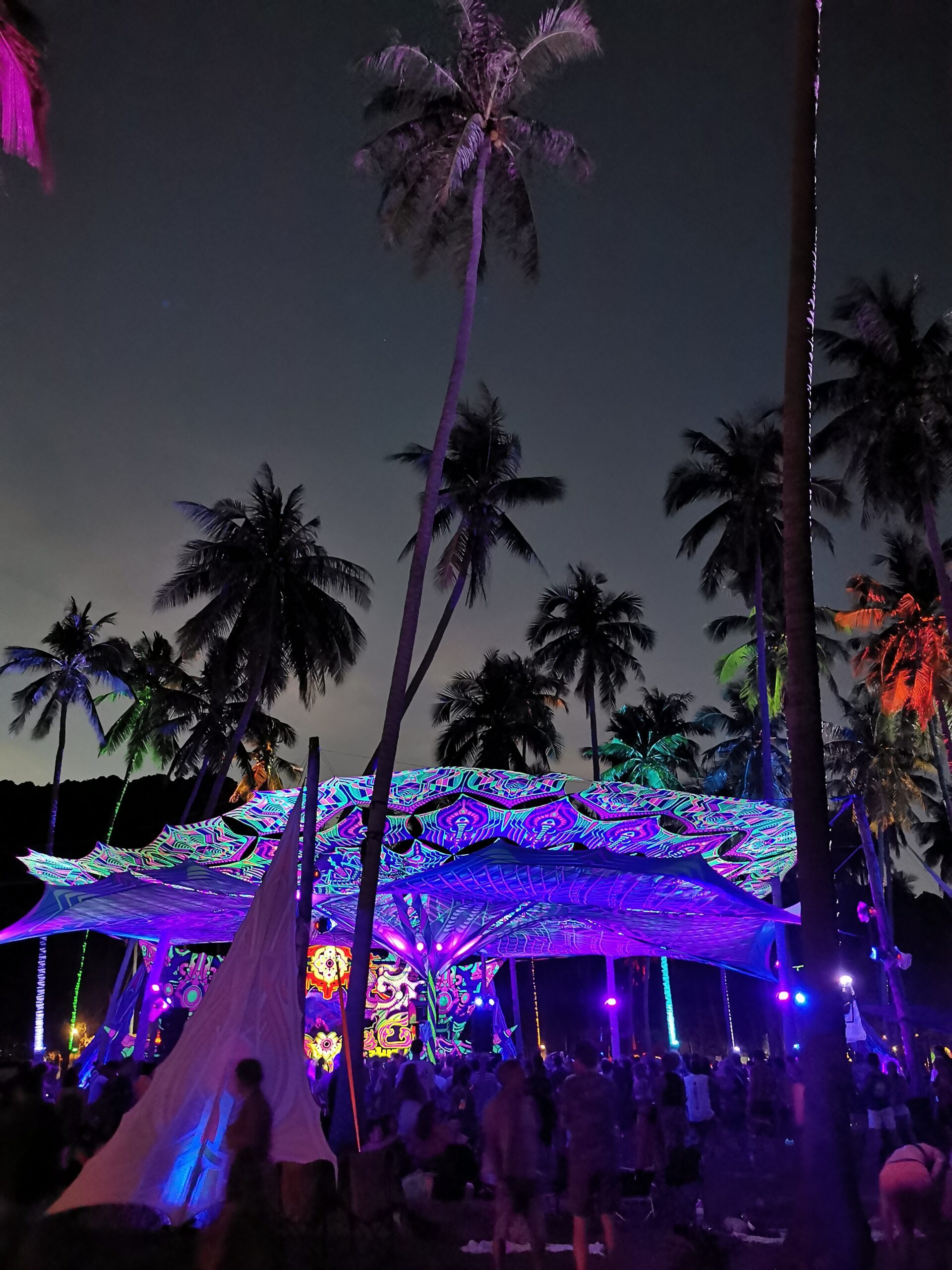 Je la retrouve donc le lendemain ainsi que Sara, une maroco germano irlandaise qu’elle avait rencontrée quelques semaines plus tôt et Nico un italien que Sara a rencontré la veille. Et on y a aussi rencontré notre voisin de campement Fabio (don’t j’ai oublié l’origine exacte mais d’Amérique du Sud). Nous y avons passé une semaine magique de danse, de plage, de chill, de rigolades, de partage d’expérience de voyage et de bonnes bouffes au petit resto au bout de la plage. Ce restaurant familial était notre petit havre de paix loin des basses chaque soir pour le dîner. Le site du festival est très beau avec des palmiers, la plage turquoise et la scène psychédélique. La plage était jonchée de détritus et Je pense qu’au moins la moitié des festivaliers, un moment où un autre, à pris un sac poubelle pour nettoyer un bout de la plage. À la fin de la semaine elle était presque nickel! Puis la grande marée de la pleine Lune à tout recouvert de plastique à nouveau… On a bien déconné avec la Planète… Pour ne pas finir sur une note négative, cette semaine était vraiment très chouette et m’a donné plein d’énergie pour la suite! Et dormir en tente sans climatisation pendant une semaine m’a permis de réellement m’habituer à la chaleur! Maintenant en route pour Bangkok où je rejoins ma sœur Sandra, mon beau-frère Loran et mon neveu Barnabé pour quelques jours!