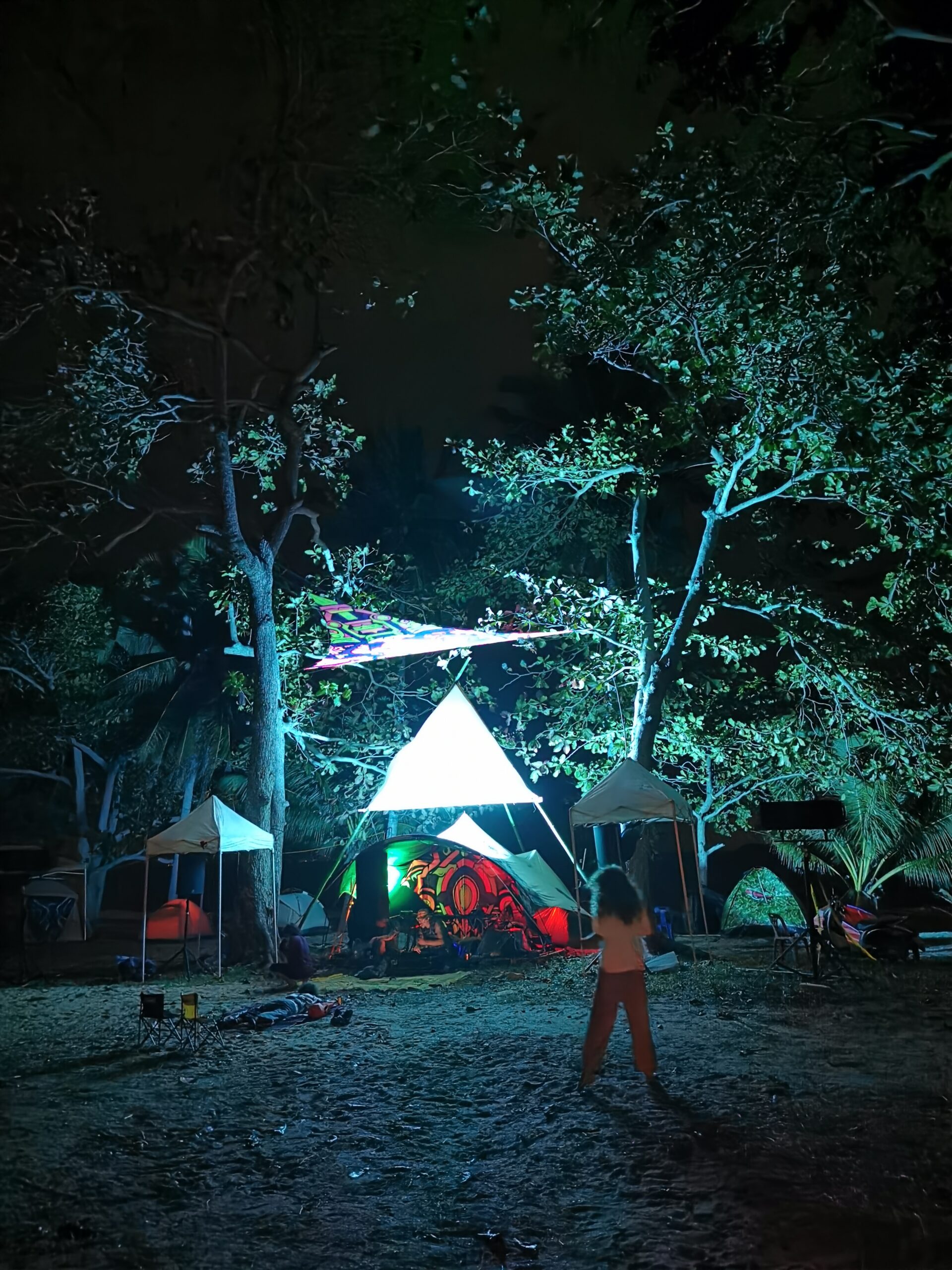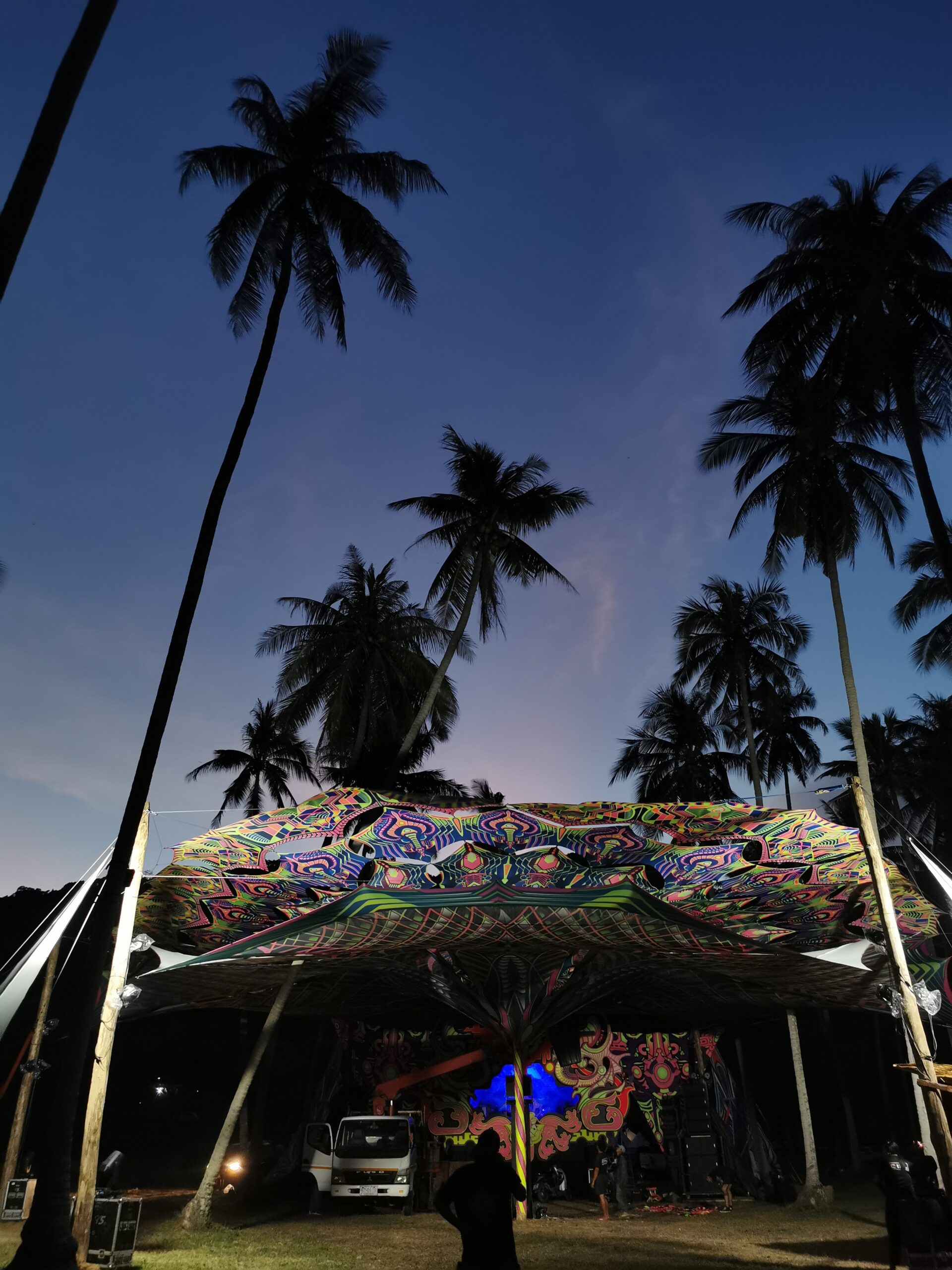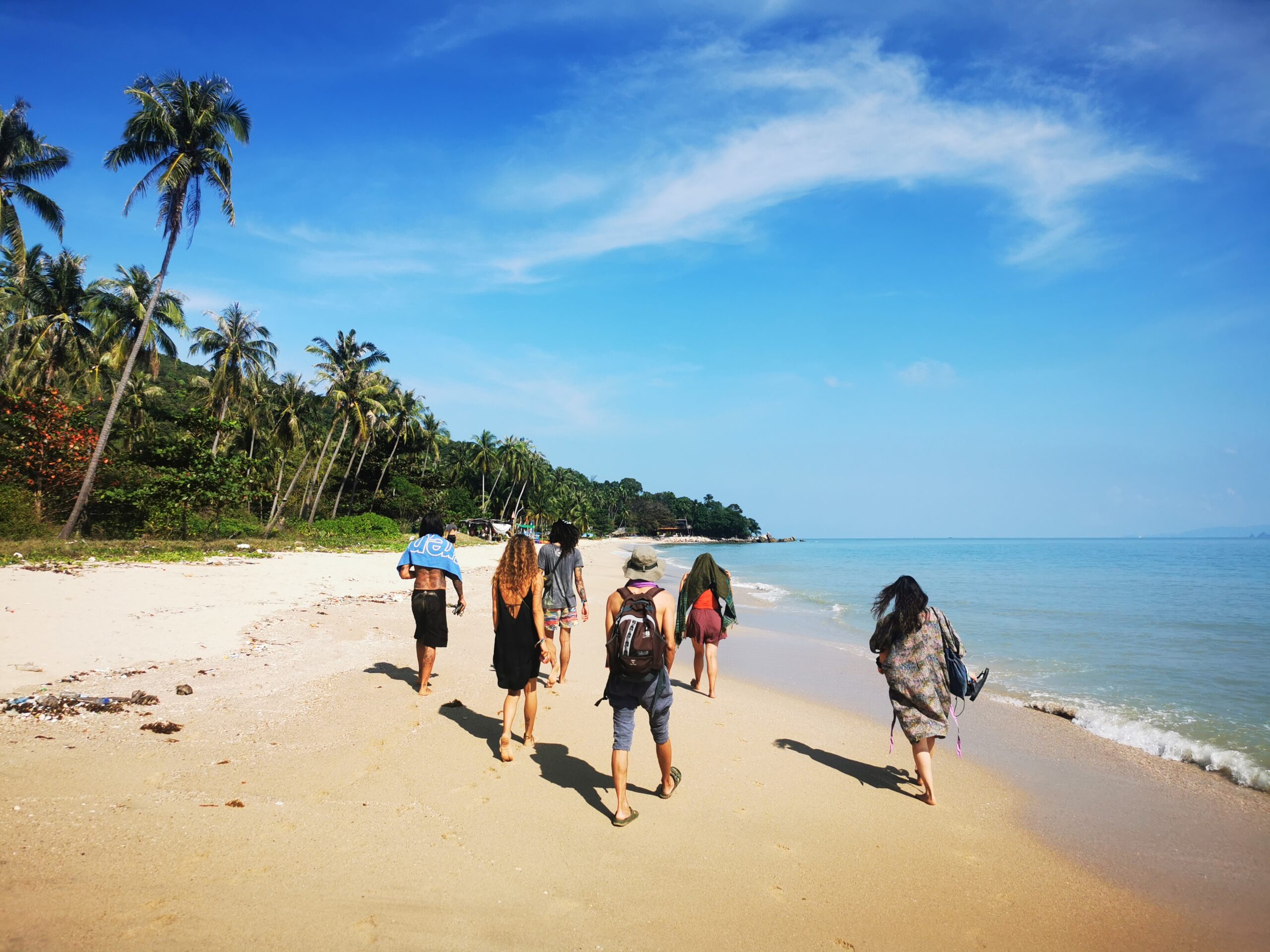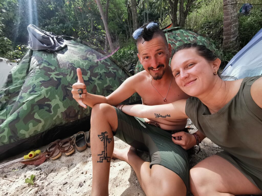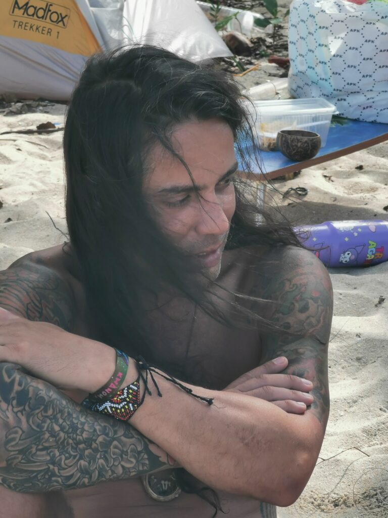 Je la retrouve donc le lendemain ainsi que Sara, une maroco germano irlandaise qu’elle avait rencontrée quelques semaines plus tôt et Nico un italien que Sara a rencontré la veille. Et on y a aussi rencontré notre voisin de campement Fabio (don’t j’ai oublié l’origine exacte mais d’Amérique du Sud). Nous y avons passé une semaine magique de danse, de plage, de chill, de rigolades, de partage d’expérience de voyage et de bonnes bouffes au petit resto au bout de la plage. Ce restaurant familial était notre petit havre de paix loin des basses chaque soir pour le dîner. Le site du festival est très beau avec des palmiers, la plage turquoise et la scène psychédélique. La plage était jonchée de détritus et Je pense qu’au moins la moitié des festivaliers, un moment où un autre, à pris un sac poubelle pour nettoyer un bout de la plage. À la fin de la semaine elle était presque nickel! Puis la grande marée de la pleine Lune à tout recouvert de plastique à nouveau… On a bien déconné avec la Planète… Pour ne pas finir sur une note négative, cette semaine était vraiment très chouette et m’a donné plein d’énergie pour la suite! Et dormir en tente sans climatisation pendant une semaine m’a permis de réellement m’habituer à la chaleur! Maintenant en route pour Bangkok où je rejoins ma sœur Sandra, mon beau-frère Loran et mon neveu Barnabé pour quelques jours!