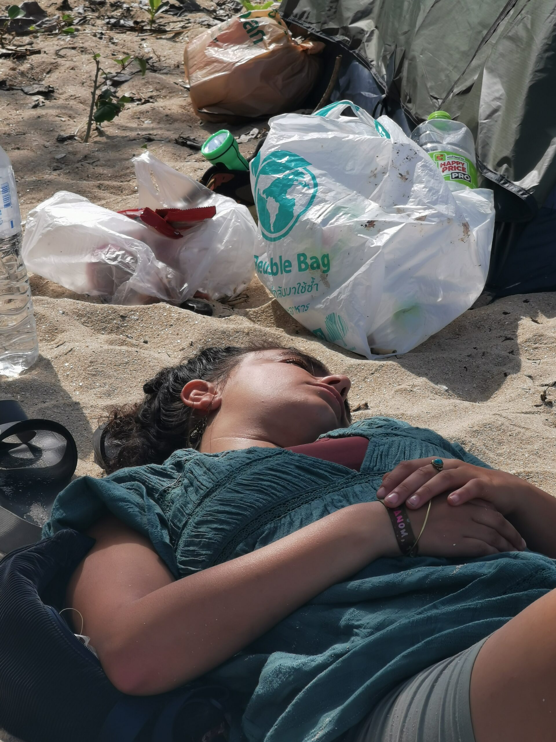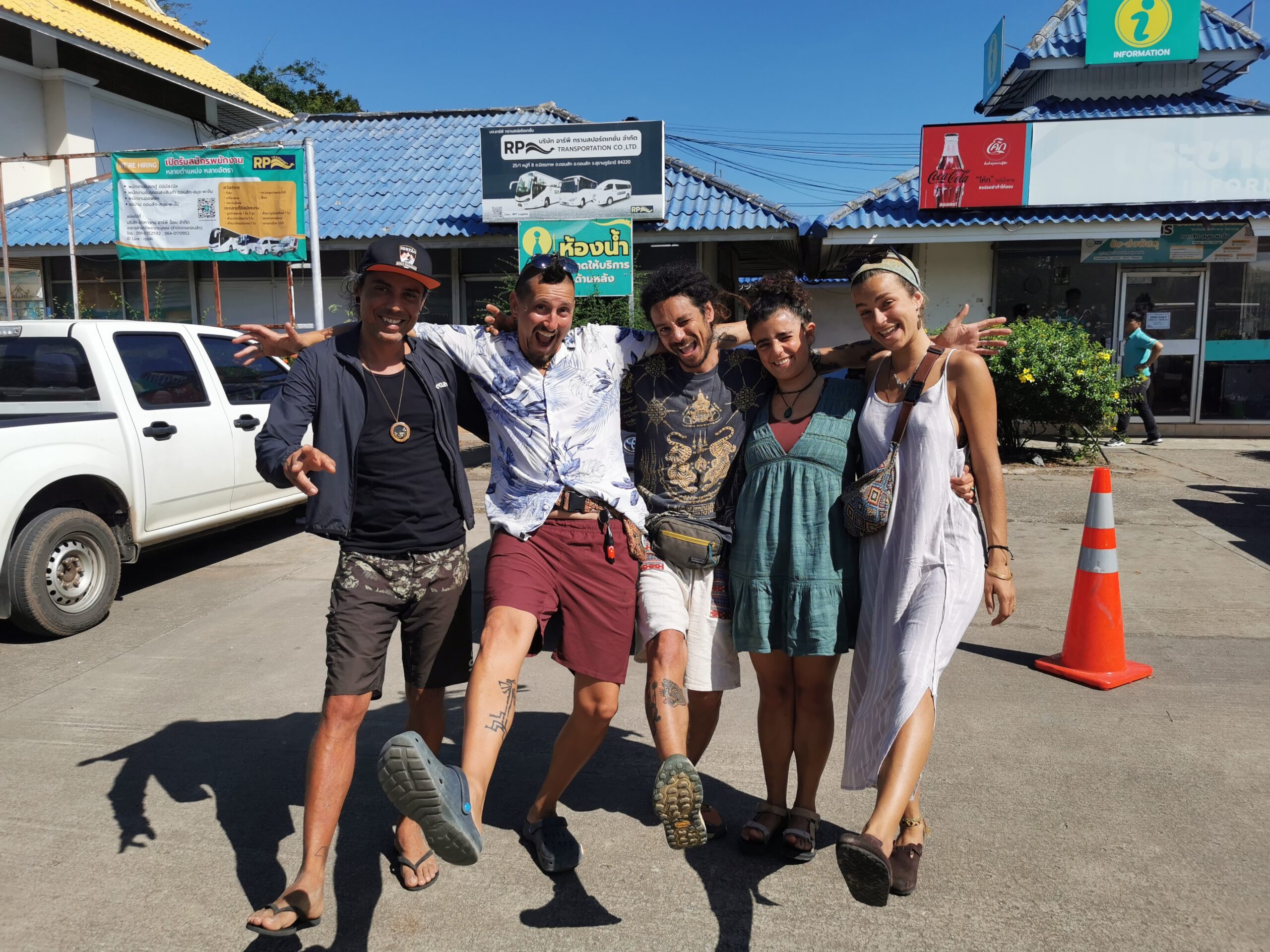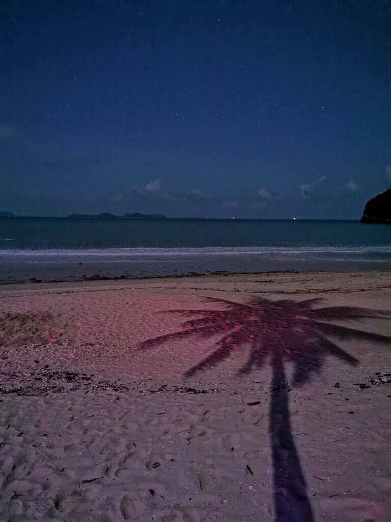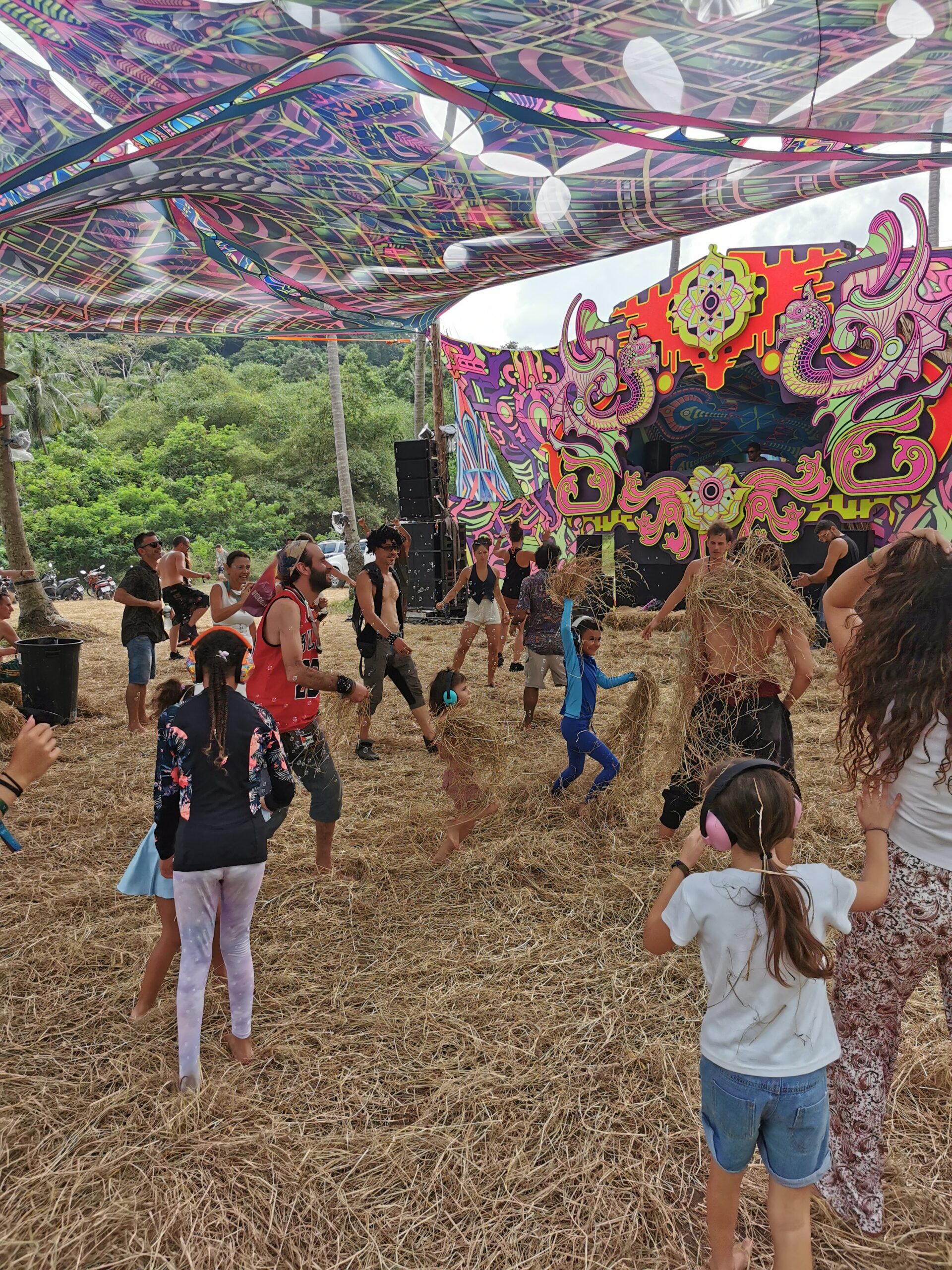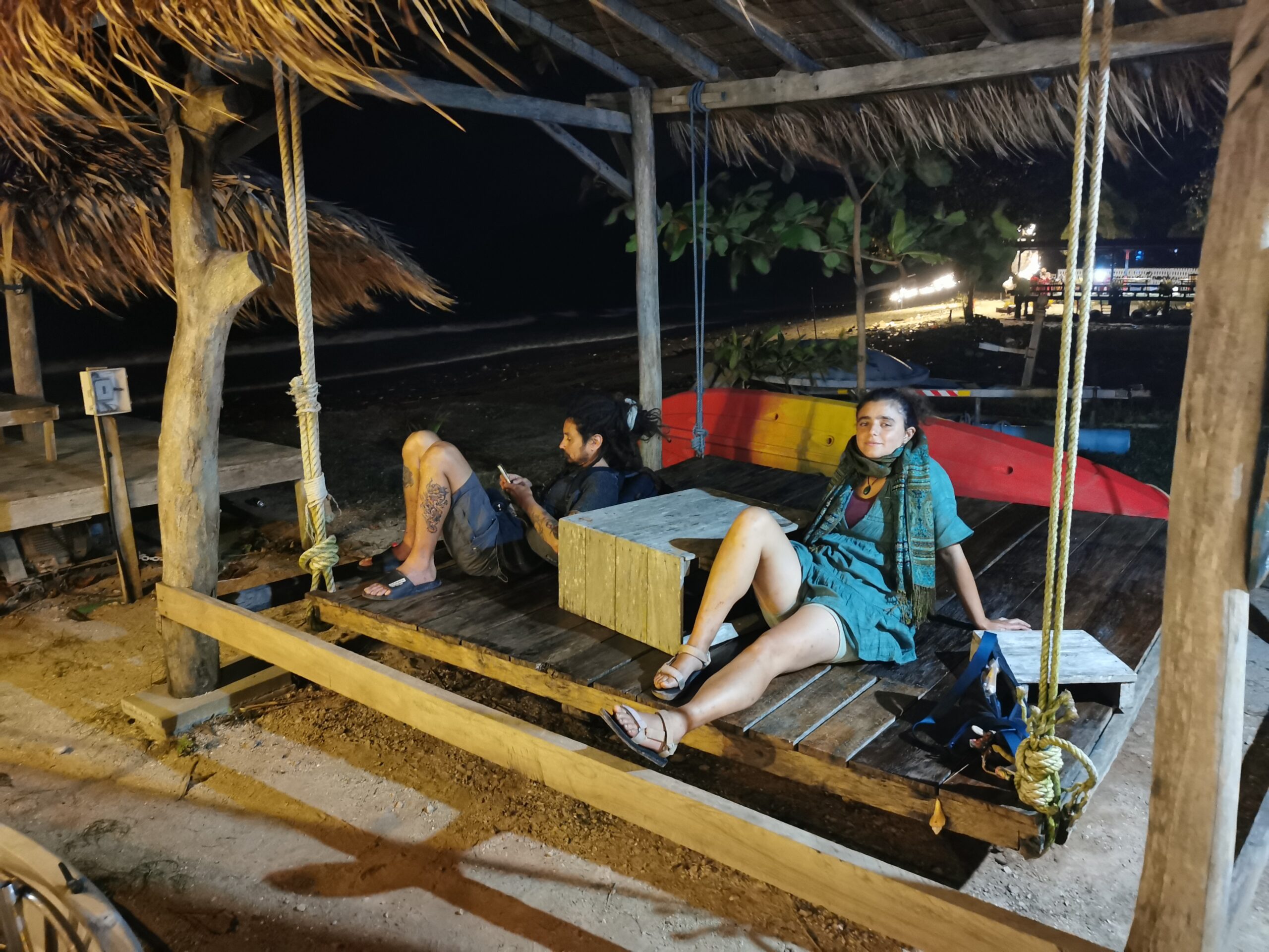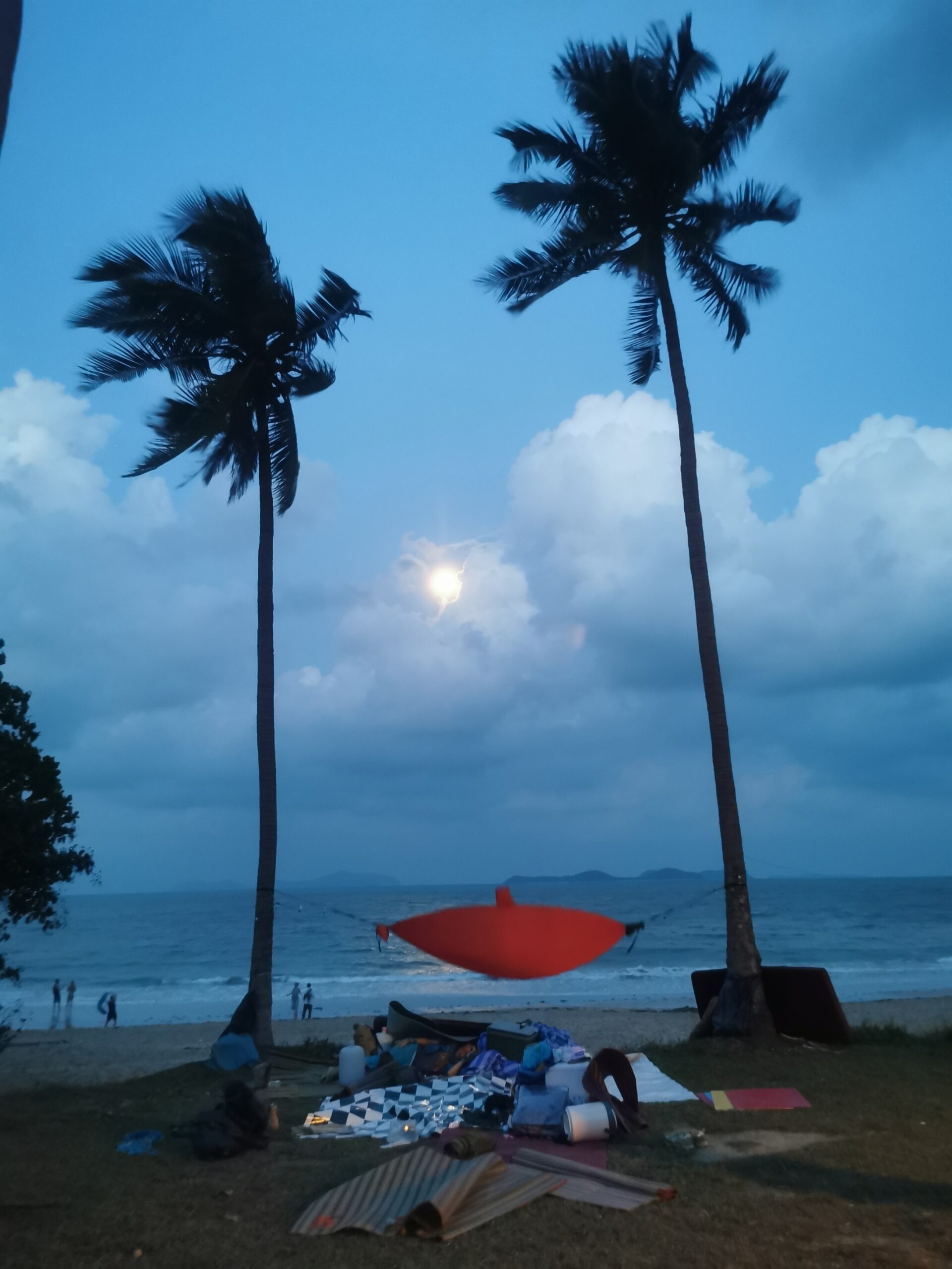 Je la retrouve donc le lendemain ainsi que Sara, une maroco germano irlandaise qu’elle avait rencontrée quelques semaines plus tôt et Nico un italien que Sara a rencontré la veille. Et on y a aussi rencontré notre voisin de campement Fabio (don’t j’ai oublié l’origine exacte mais d’Amérique du Sud). Nous y avons passé une semaine magique de danse, de plage, de chill, de rigolades, de partage d’expérience de voyage et de bonnes bouffes au petit resto au bout de la plage. Ce restaurant familial était notre petit havre de paix loin des basses chaque soir pour le dîner. Le site du festival est très beau avec des palmiers, la plage turquoise et la scène psychédélique. La plage était jonchée de détritus et Je pense qu’au moins la moitié des festivaliers, un moment où un autre, à pris un sac poubelle pour nettoyer un bout de la plage. À la fin de la semaine elle était presque nickel! Puis la grande marée de la pleine Lune à tout recouvert de plastique à nouveau… On a bien déconné avec la Planète… Pour ne pas finir sur une note négative, cette semaine était vraiment très chouette et m’a donné plein d’énergie pour la suite! Et dormir en tente sans climatisation pendant une semaine m’a permis de réellement m’habituer à la chaleur! Maintenant en route pour Bangkok où je rejoins ma sœur Sandra, mon beau-frère Loran et mon neveu Barnabé pour quelques jours!