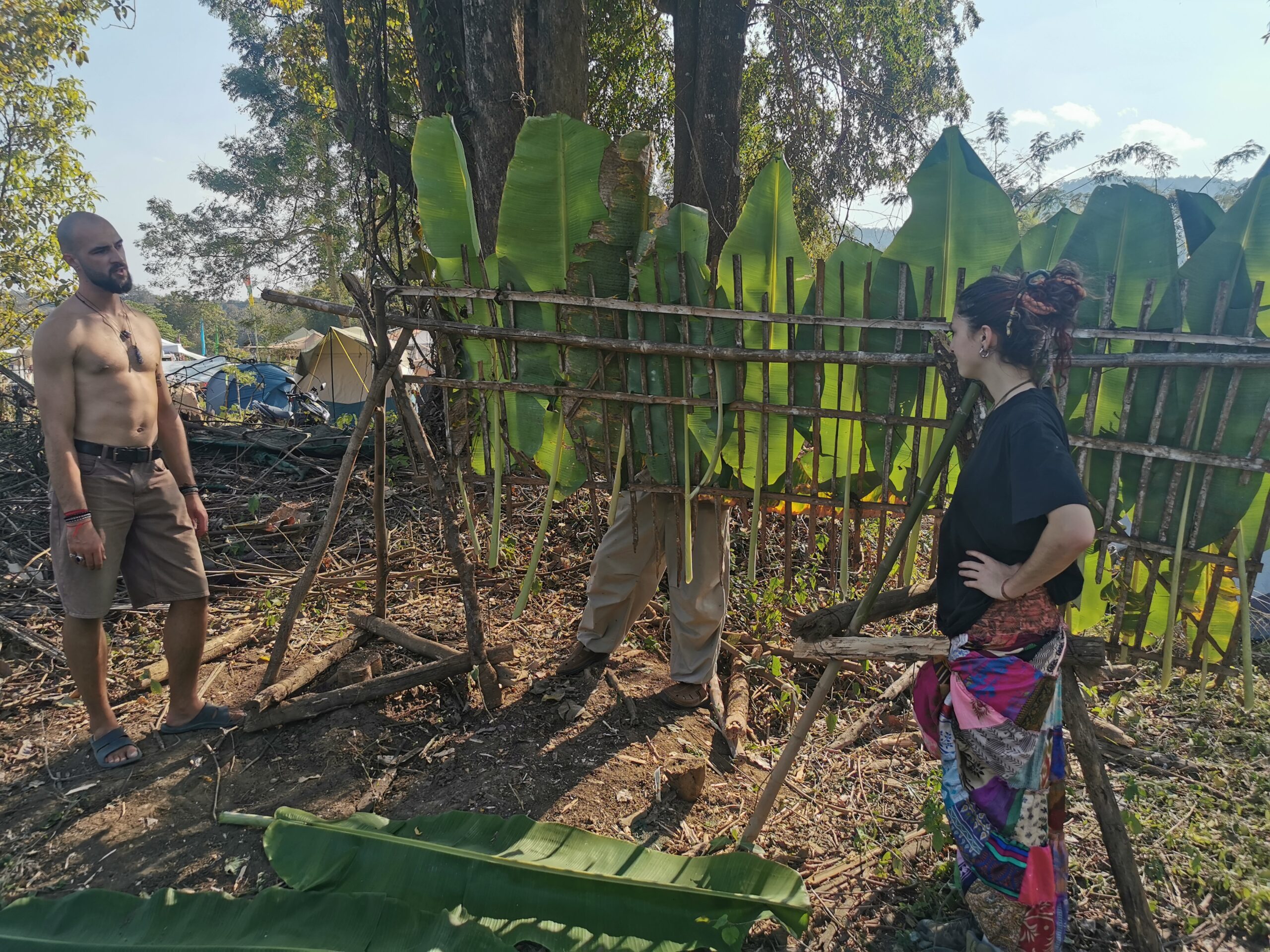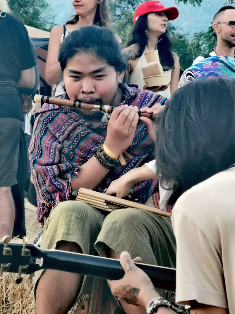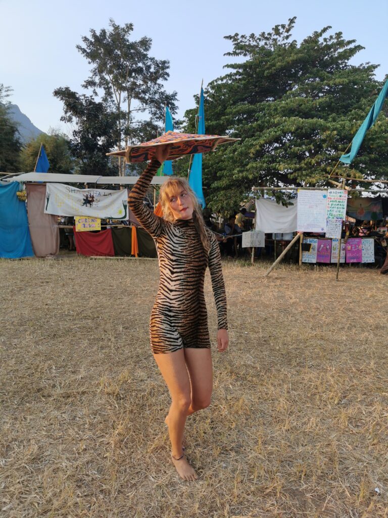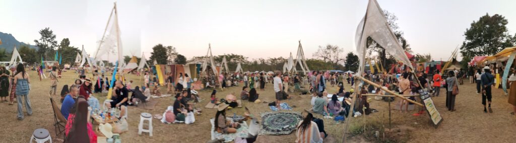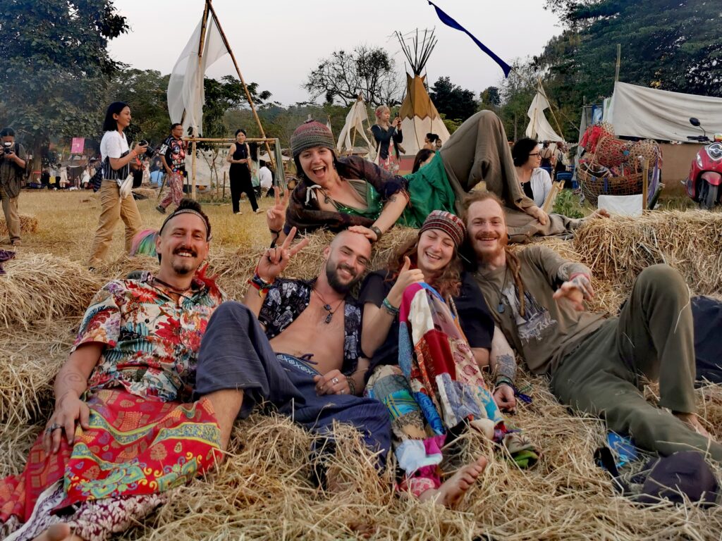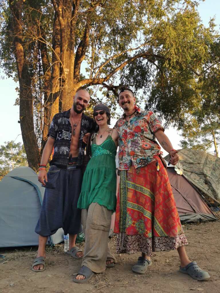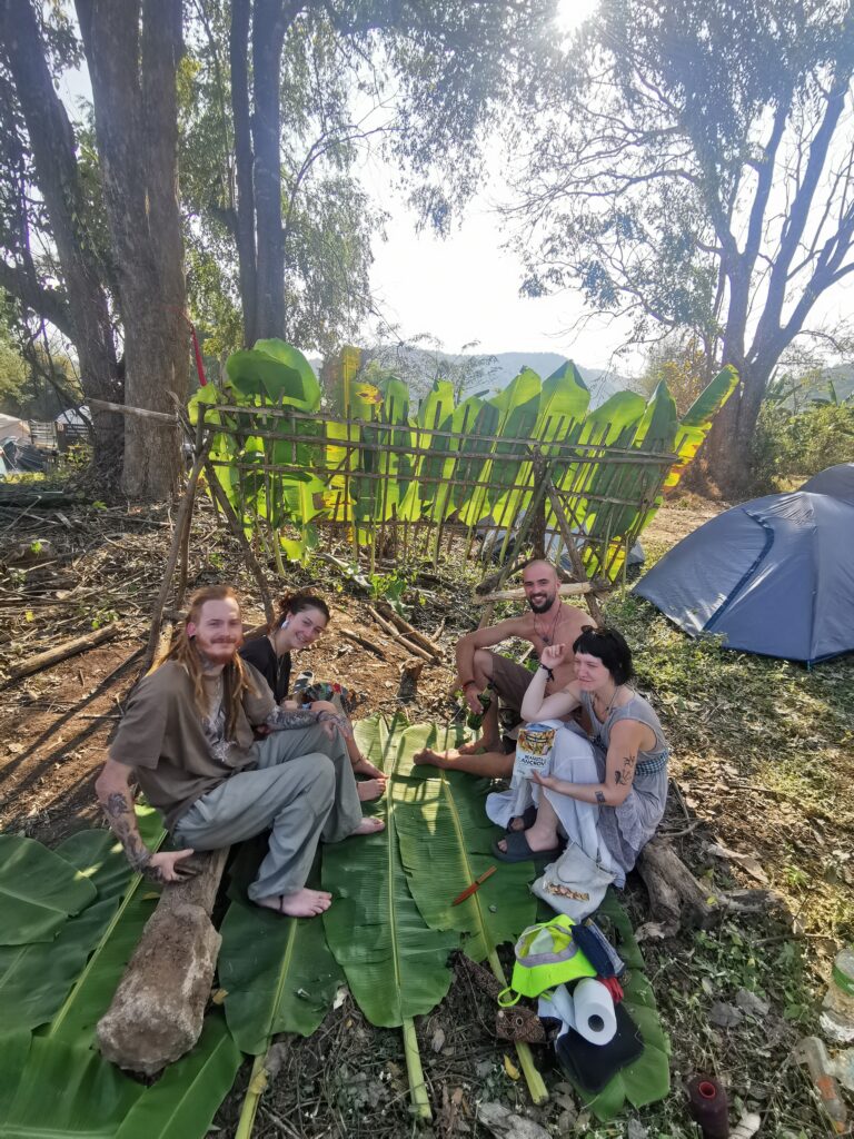 Après avoir hésité un long moment, je suis RAVI d’être resté un peu plus longtemps en Thaïlande pour assister à ce festival merveilleux!!!! Festival organisé depuis 2010 par des hippies japonais sur un site vraiment magnifique dans les montagnes de Chiang Dao. Avec Arnaud et Laurence nous rencontrons Elisa et Mattheo, un couple de jeunes français trop mignons avec qui nous installons un abris en feuilles de bananes pour nous protéger du soleil et avec qui nous passons les cinq premiers jours du festival. Ces premiers jours nous profitons à fond des concerts le soir (que de la musique instrumentale, pas d’électro…), des ateliers en tout genre (thérapie sonore, yoga méditation, tantra, danse…) et j’organise des ateliers “Créez votre propre bijou” qui fonctionnent super bien. Et je refait du jonglage de feu pour la première fois depuis plus de quinze ans!!!! Le cinquième jour c’est pause musicale et c’est l’occasion idéale pour nous prélasser au bord de la rivière à l’ombre des arbres (tous plus beaux les uns que les autres!), pour nous baigner dans les sources chaudes et pour nous reposer un peu. Et les cinq derniers jours se passent sans embûche mais avec une énergie plus calme. Après avoir discuté avec des DJ en dehors du festival, Arnaud nous fait un set électro d’une heure et demi sur lequel je me régale (ça m’a un peu manqué de taper du pied…). Et c’est là que nous rencontrons Orlane et Angie, un couple de parisiennes adorables avec qui le courant passe tout de suite! C’est grâce à elles que nous rencontrons ensuite Minh, une nana en or, son fils Alex et sa chèrie Bella. Minh a 75 ans mais elle en paraît à peine 55, elle a une pêche d’enfer et nous raconte sa vie pleine de rebondissements et d’aventure, une vraie inspiration pour le futur!!!!! Si ce festival durait un mois je pense que je n’en bougerais pas!!!!