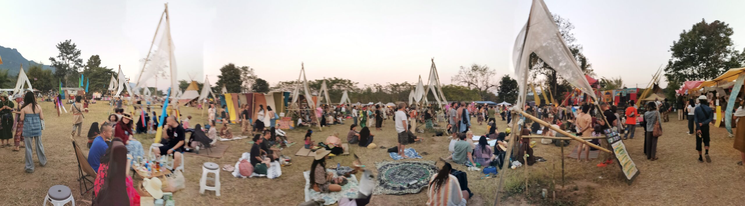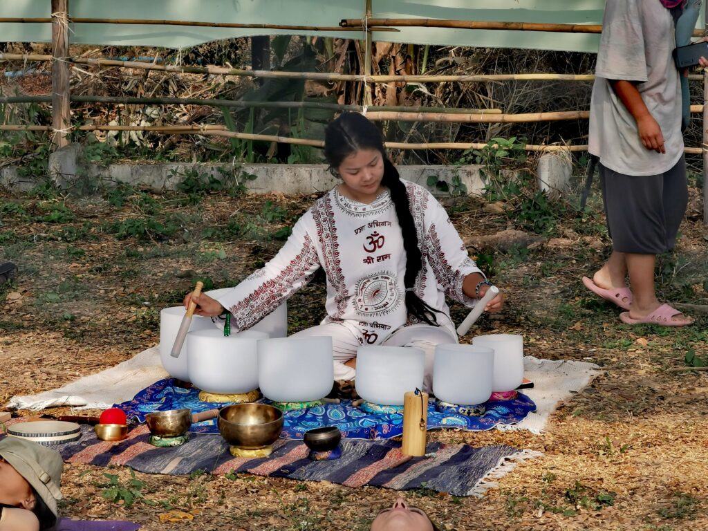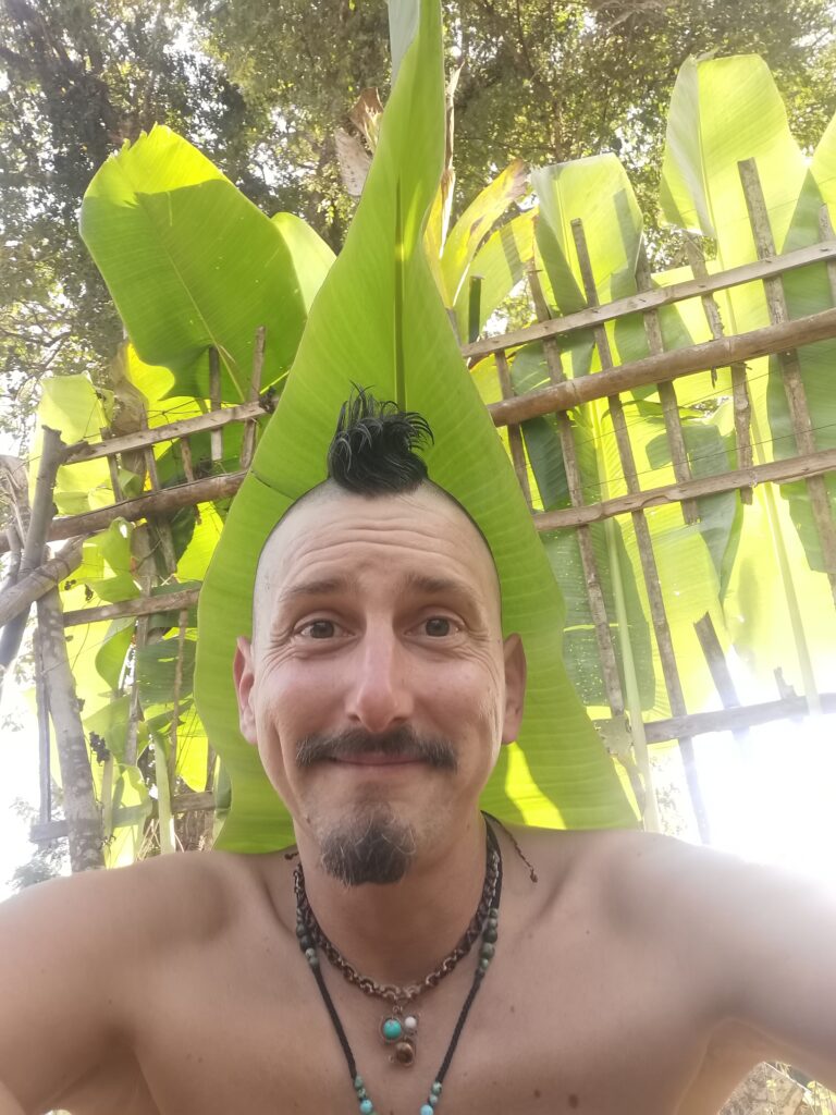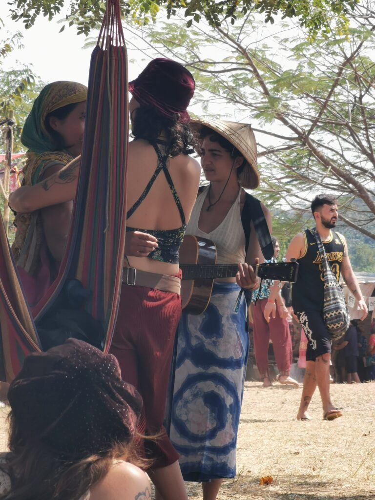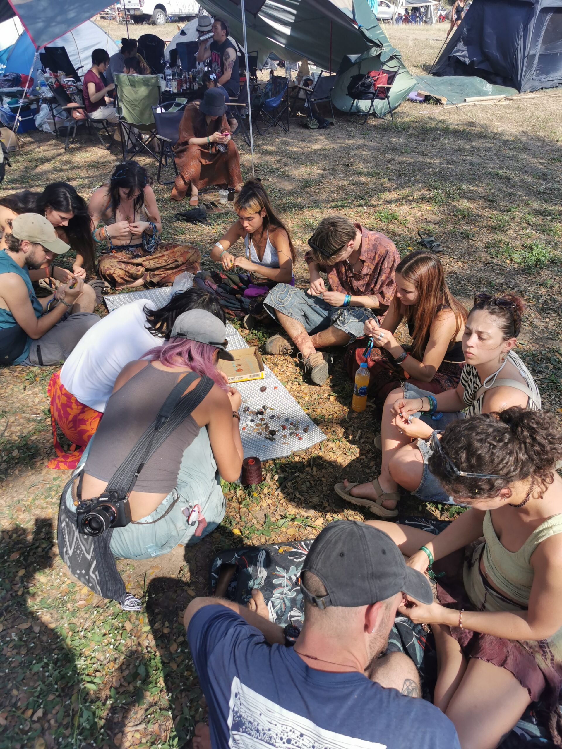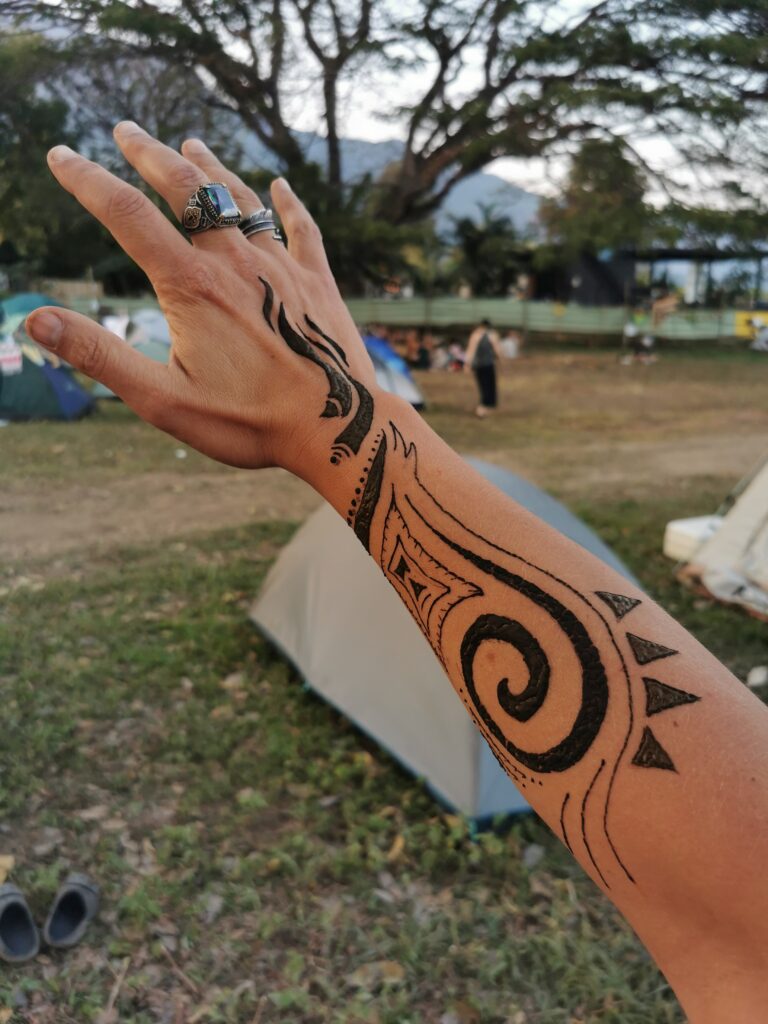 Après avoir hésité un long moment, je suis RAVI d’être resté un peu plus longtemps en Thaïlande pour assister à ce festival merveilleux!!!! Festival organisé depuis 2010 par des hippies japonais sur un site vraiment magnifique dans les montagnes de Chiang Dao. Avec Arnaud et Laurence nous rencontrons Elisa et Mattheo, un couple de jeunes français trop mignons avec qui nous installons un abris en feuilles de bananes pour nous protéger du soleil et avec qui nous passons les cinq premiers jours du festival. Ces premiers jours nous profitons à fond des concerts le soir (que de la musique instrumentale, pas d’électro…), des ateliers en tout genre (thérapie sonore, yoga méditation, tantra, danse…) et j’organise des ateliers “Créez votre propre bijou” qui fonctionnent super bien. Et je refait du jonglage de feu pour la première fois depuis plus de quinze ans!!!! Le cinquième jour c’est pause musicale et c’est l’occasion idéale pour nous prélasser au bord de la rivière à l’ombre des arbres (tous plus beaux les uns que les autres!), pour nous baigner dans les sources chaudes et pour nous reposer un peu. Et les cinq derniers jours se passent sans embûche mais avec une énergie plus calme. Après avoir discuté avec des DJ en dehors du festival, Arnaud nous fait un set électro d’une heure et demi sur lequel je me régale (ça m’a un peu manqué de taper du pied…). Et c’est là que nous rencontrons Orlane et Angie, un couple de parisiennes adorables avec qui le courant passe tout de suite! C’est grâce à elles que nous rencontrons ensuite Minh, une nana en or, son fils Alex et sa chèrie Bella. Minh a 75 ans mais elle en paraît à peine 55, elle a une pêche d’enfer et nous raconte sa vie pleine de rebondissements et d’aventure, une vraie inspiration pour le futur!!!!! Si ce festival durait un mois je pense que je n’en bougerais pas!!!!
