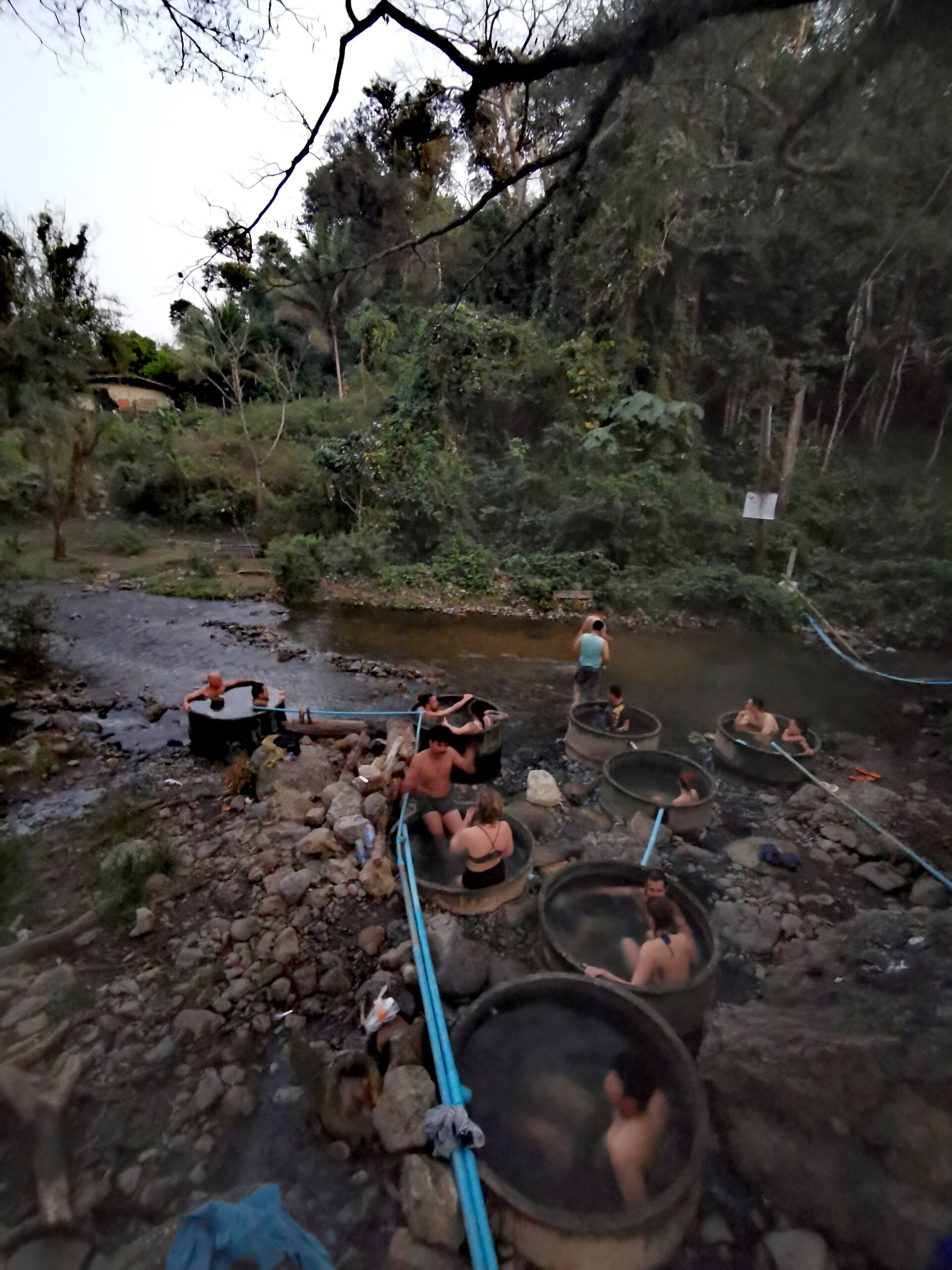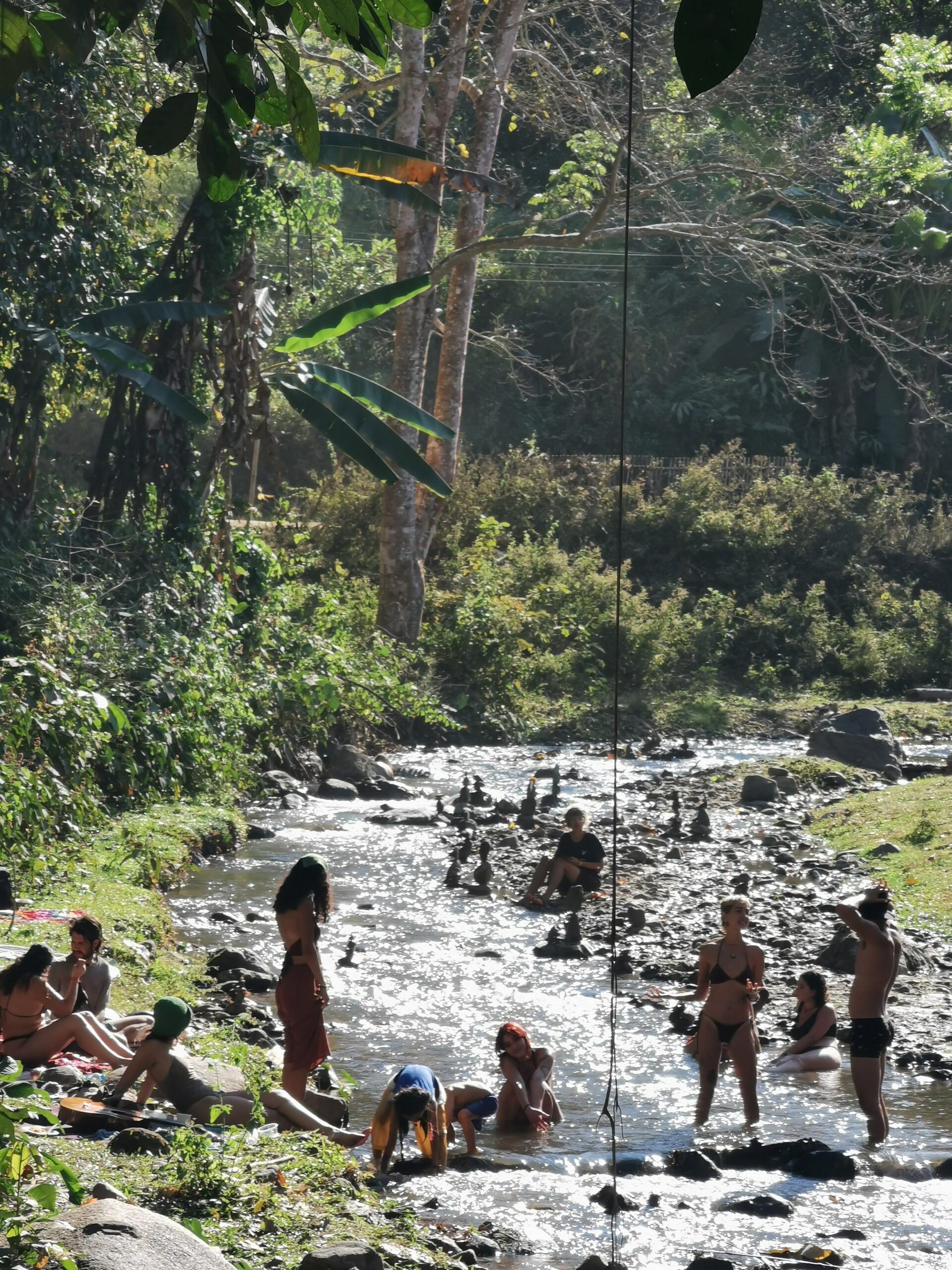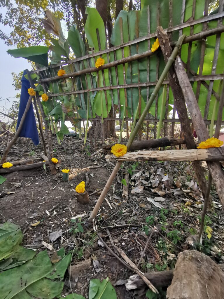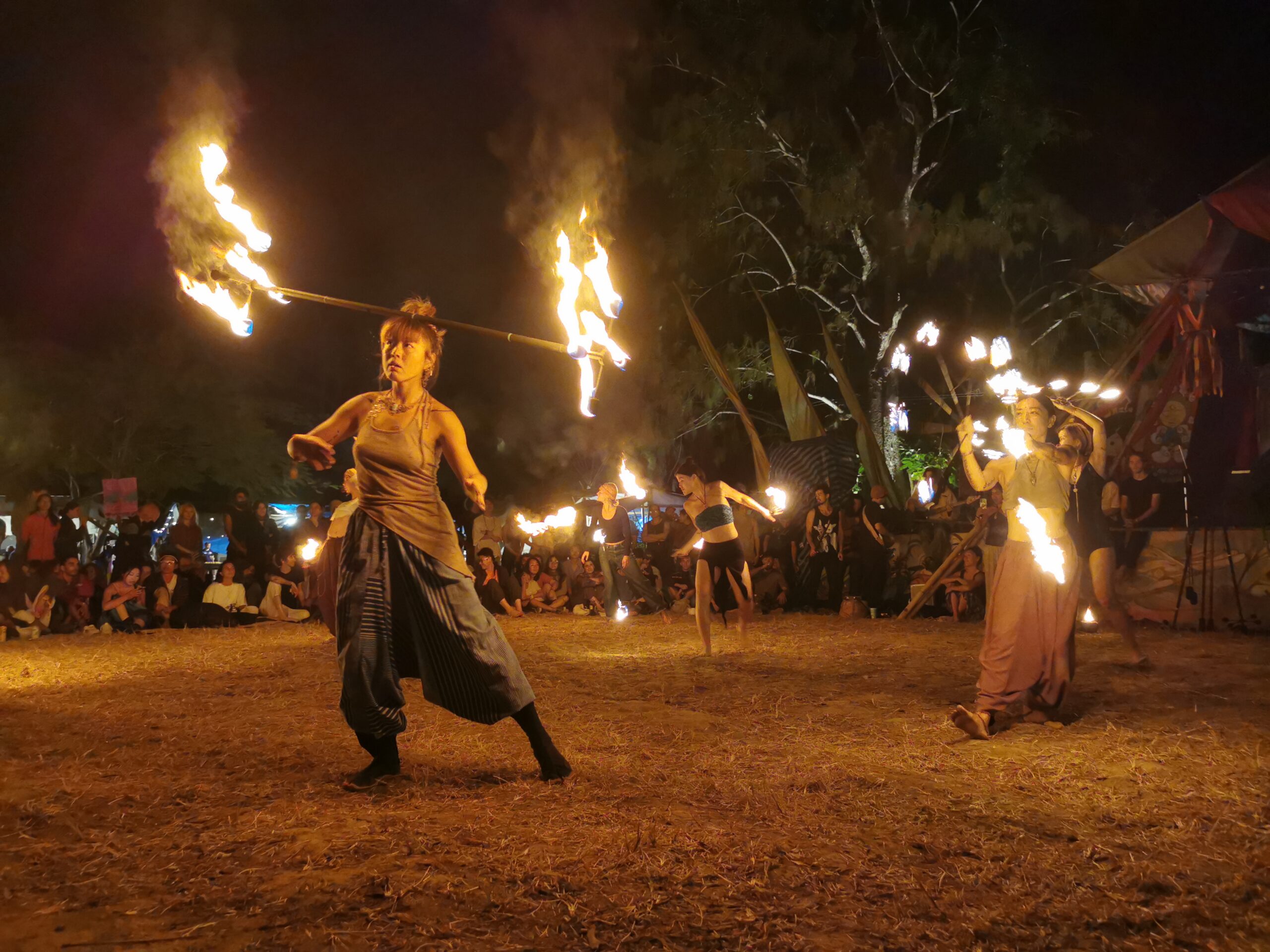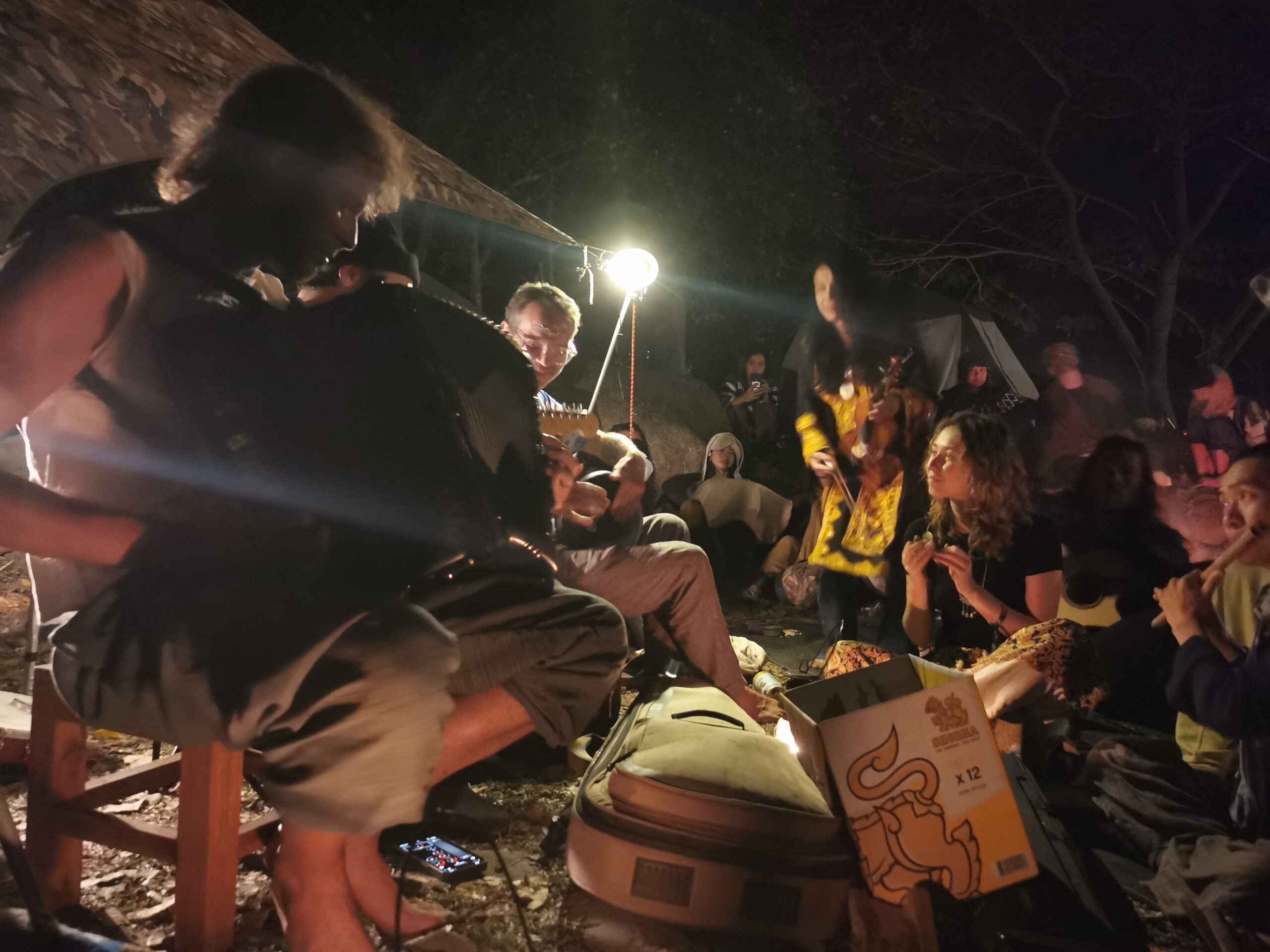 Après avoir hésité un long moment, je suis RAVI d’être resté un peu plus longtemps en Thaïlande pour assister à ce festival merveilleux!!!! Festival organisé depuis 2010 par des hippies japonais sur un site vraiment magnifique dans les montagnes de Chiang Dao. Avec Arnaud et Laurence nous rencontrons Elisa et Mattheo, un couple de jeunes français trop mignons avec qui nous installons un abris en feuilles de bananes pour nous protéger du soleil et avec qui nous passons les cinq premiers jours du festival. Ces premiers jours nous profitons à fond des concerts le soir (que de la musique instrumentale, pas d’électro…), des ateliers en tout genre (thérapie sonore, yoga méditation, tantra, danse…) et j’organise des ateliers “Créez votre propre bijou” qui fonctionnent super bien. Et je refait du jonglage de feu pour la première fois depuis plus de quinze ans!!!! Le cinquième jour c’est pause musicale et c’est l’occasion idéale pour nous prélasser au bord de la rivière à l’ombre des arbres (tous plus beaux les uns que les autres!), pour nous baigner dans les sources chaudes et pour nous reposer un peu. Et les cinq derniers jours se passent sans embûche mais avec une énergie plus calme. Après avoir discuté avec des DJ en dehors du festival, Arnaud nous fait un set électro d’une heure et demi sur lequel je me régale (ça m’a un peu manqué de taper du pied…). Et c’est là que nous rencontrons Orlane et Angie, un couple de parisiennes adorables avec qui le courant passe tout de suite! C’est grâce à elles que nous rencontrons ensuite Minh, une nana en or, son fils Alex et sa chèrie Bella. Minh a 75 ans mais elle en paraît à peine 55, elle a une pêche d’enfer et nous raconte sa vie pleine de rebondissements et d’aventure, une vraie inspiration pour le futur!!!!! Si ce festival durait un mois je pense que je n’en bougerais pas!!!!