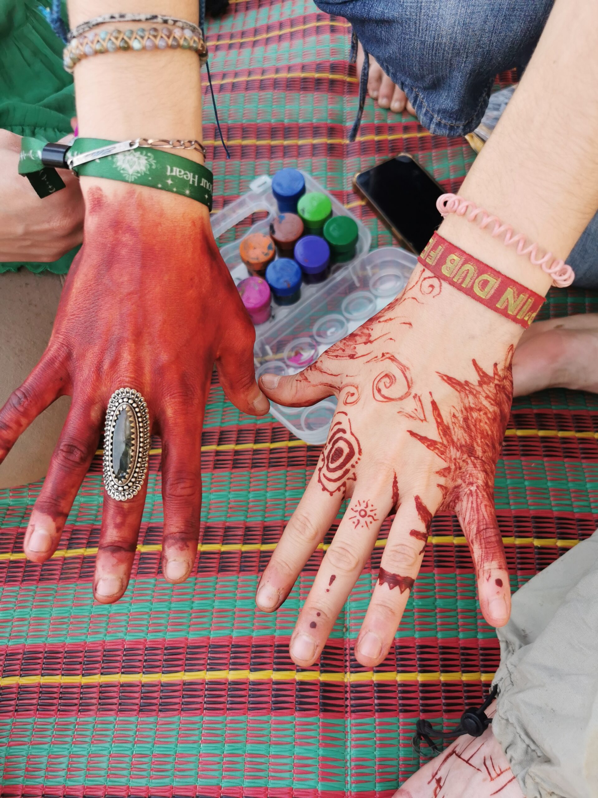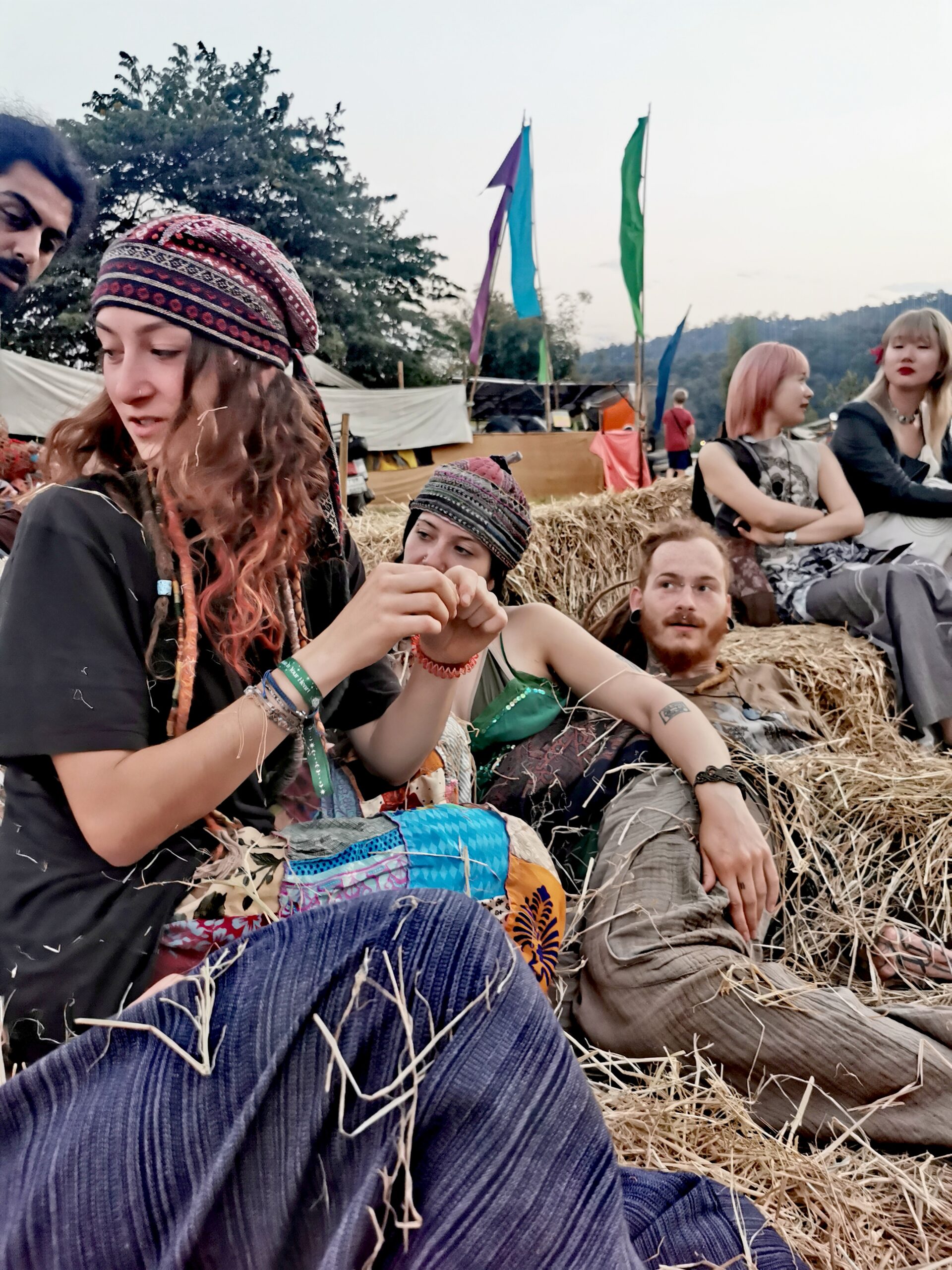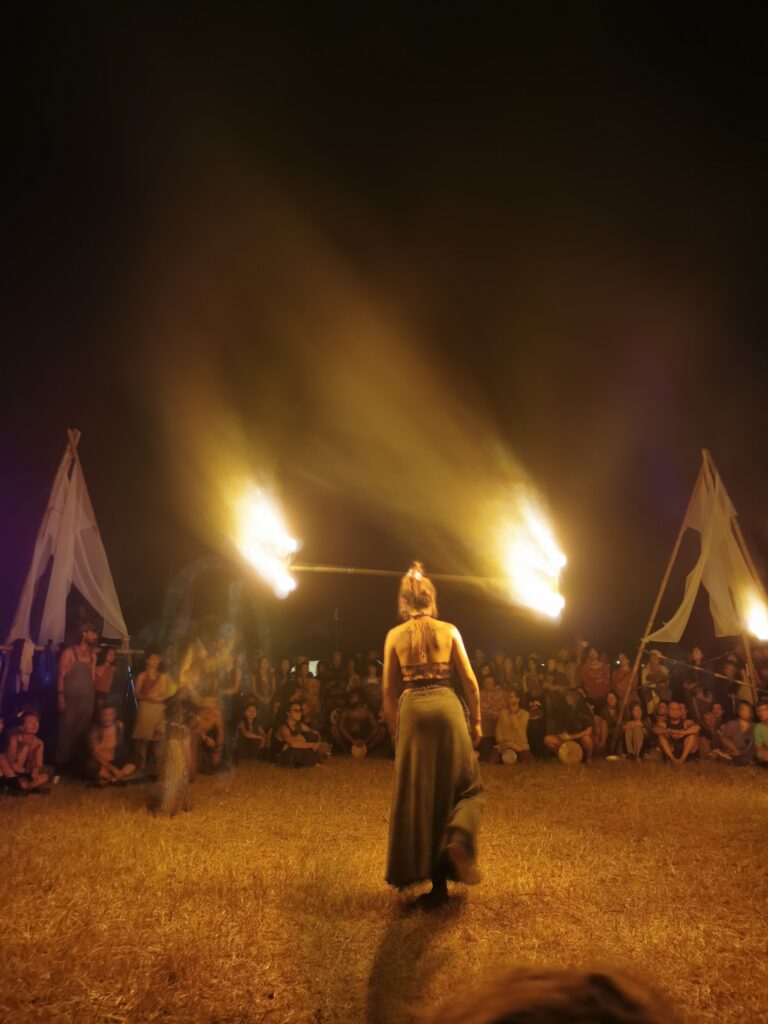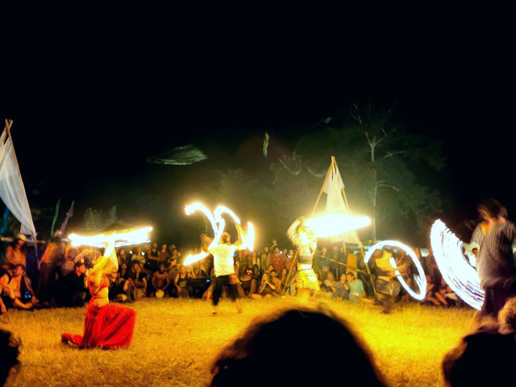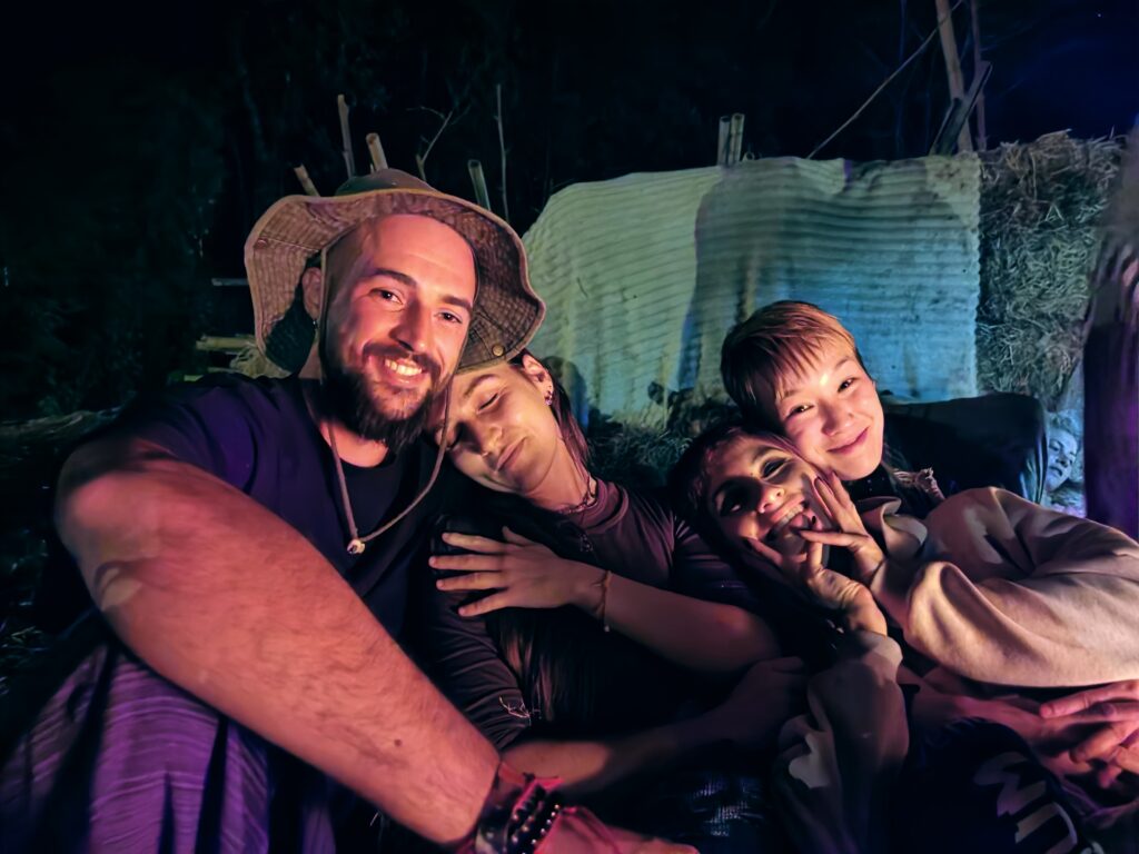 Après avoir hésité un long moment, je suis RAVI d’être resté un peu plus longtemps en Thaïlande pour assister à ce festival merveilleux!!!! Festival organisé depuis 2010 par des hippies japonais sur un site vraiment magnifique dans les montagnes de Chiang Dao. Avec Arnaud et Laurence nous rencontrons Elisa et Mattheo, un couple de jeunes français trop mignons avec qui nous installons un abris en feuilles de bananes pour nous protéger du soleil et avec qui nous passons les cinq premiers jours du festival. Ces premiers jours nous profitons à fond des concerts le soir (que de la musique instrumentale, pas d’électro…), des ateliers en tout genre (thérapie sonore, yoga méditation, tantra, danse…) et j’organise des ateliers “Créez votre propre bijou” qui fonctionnent super bien. Et je refait du jonglage de feu pour la première fois depuis plus de quinze ans!!!! Le cinquième jour c’est pause musicale et c’est l’occasion idéale pour nous prélasser au bord de la rivière à l’ombre des arbres (tous plus beaux les uns que les autres!), pour nous baigner dans les sources chaudes et pour nous reposer un peu. Et les cinq derniers jours se passent sans embûche mais avec une énergie plus calme. Après avoir discuté avec des DJ en dehors du festival, Arnaud nous fait un set électro d’une heure et demi sur lequel je me régale (ça m’a un peu manqué de taper du pied…). Et c’est là que nous rencontrons Orlane et Angie, un couple de parisiennes adorables avec qui le courant passe tout de suite! C’est grâce à elles que nous rencontrons ensuite Minh, une nana en or, son fils Alex et sa chèrie Bella. Minh a 75 ans mais elle en paraît à peine 55, elle a une pêche d’enfer et nous raconte sa vie pleine de rebondissements et d’aventure, une vraie inspiration pour le futur!!!!! Si ce festival durait un mois je pense que je n’en bougerais pas!!!!