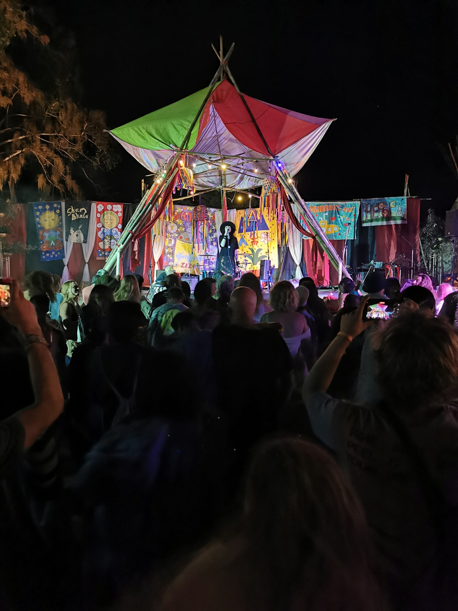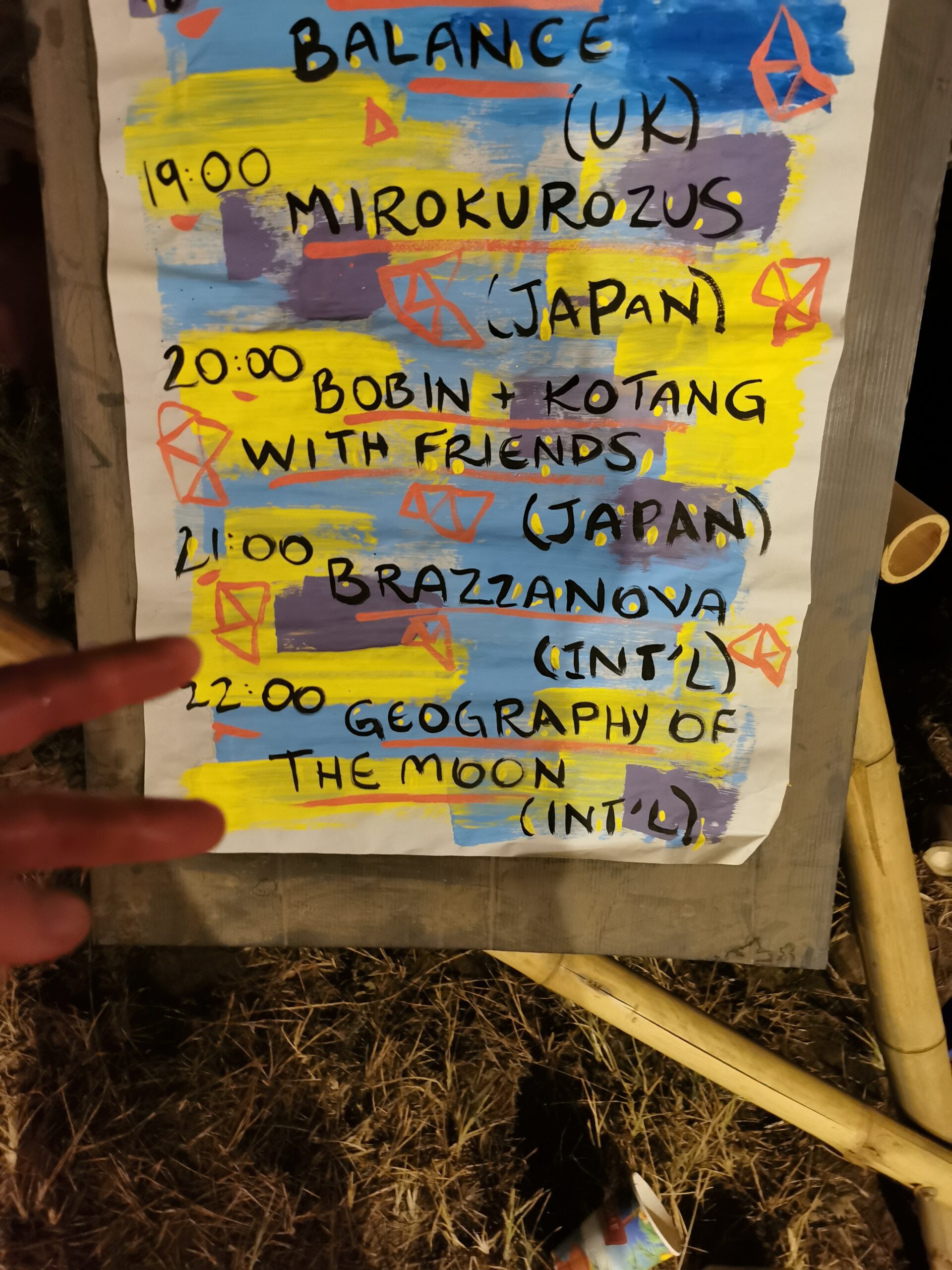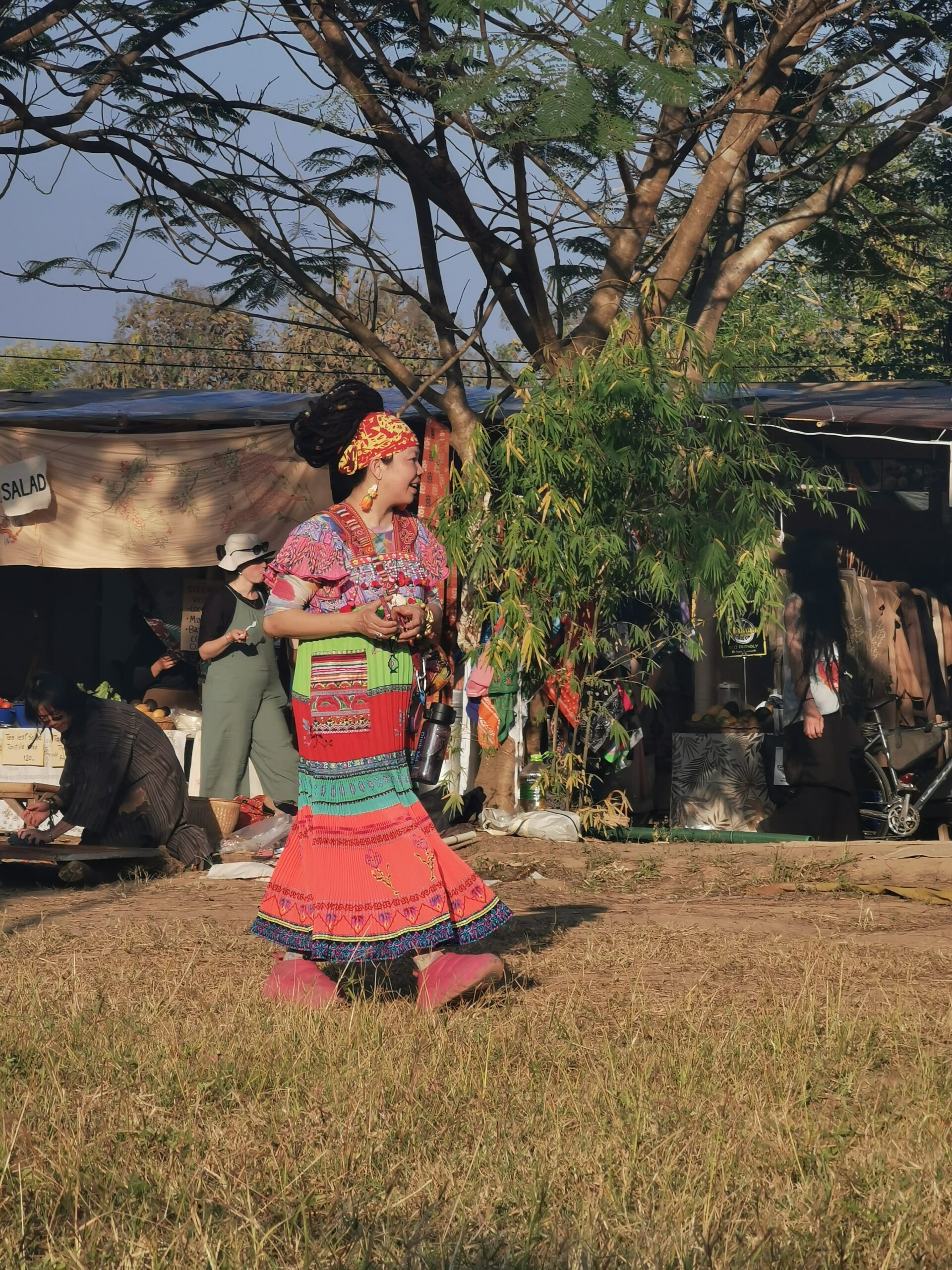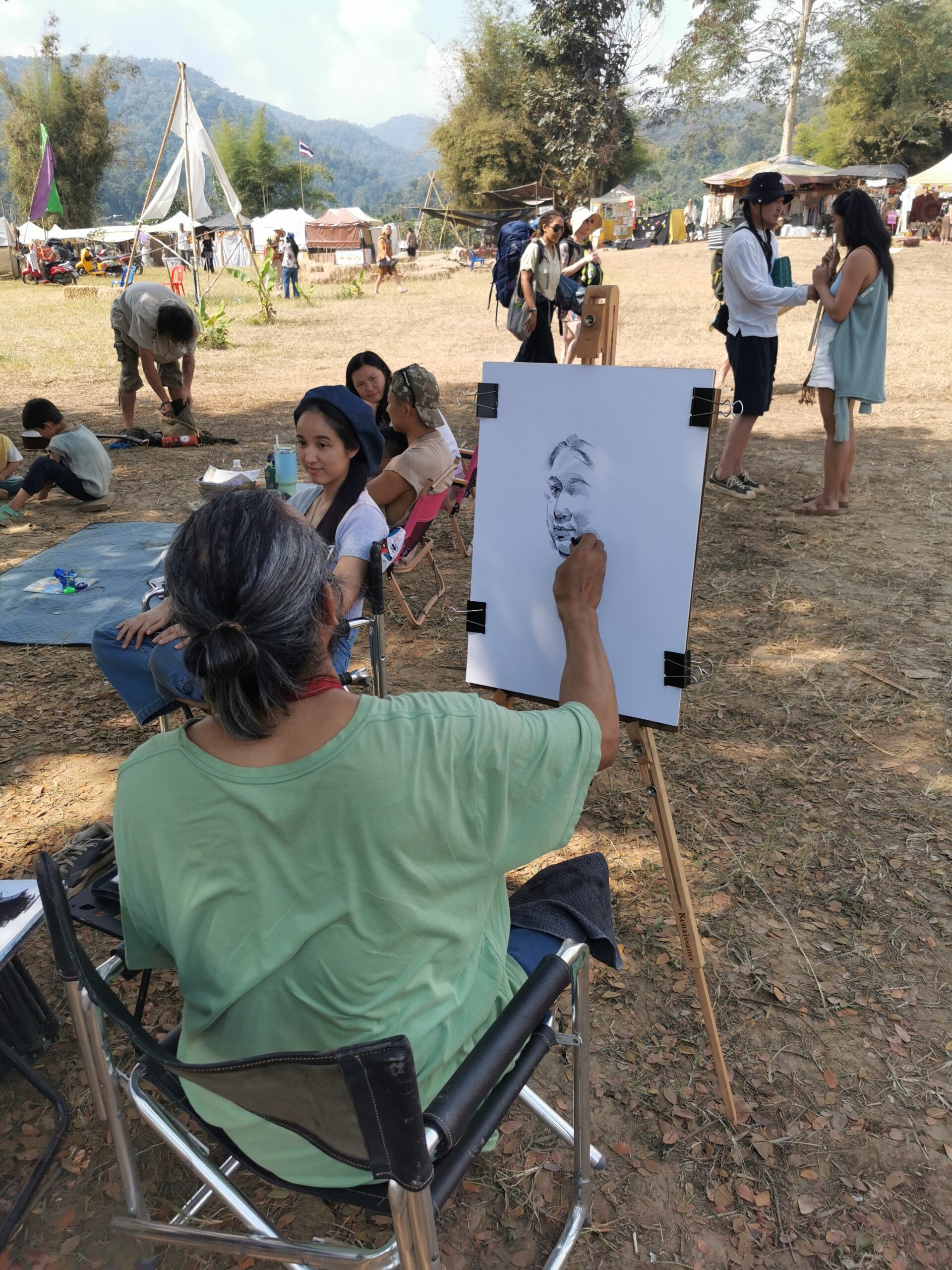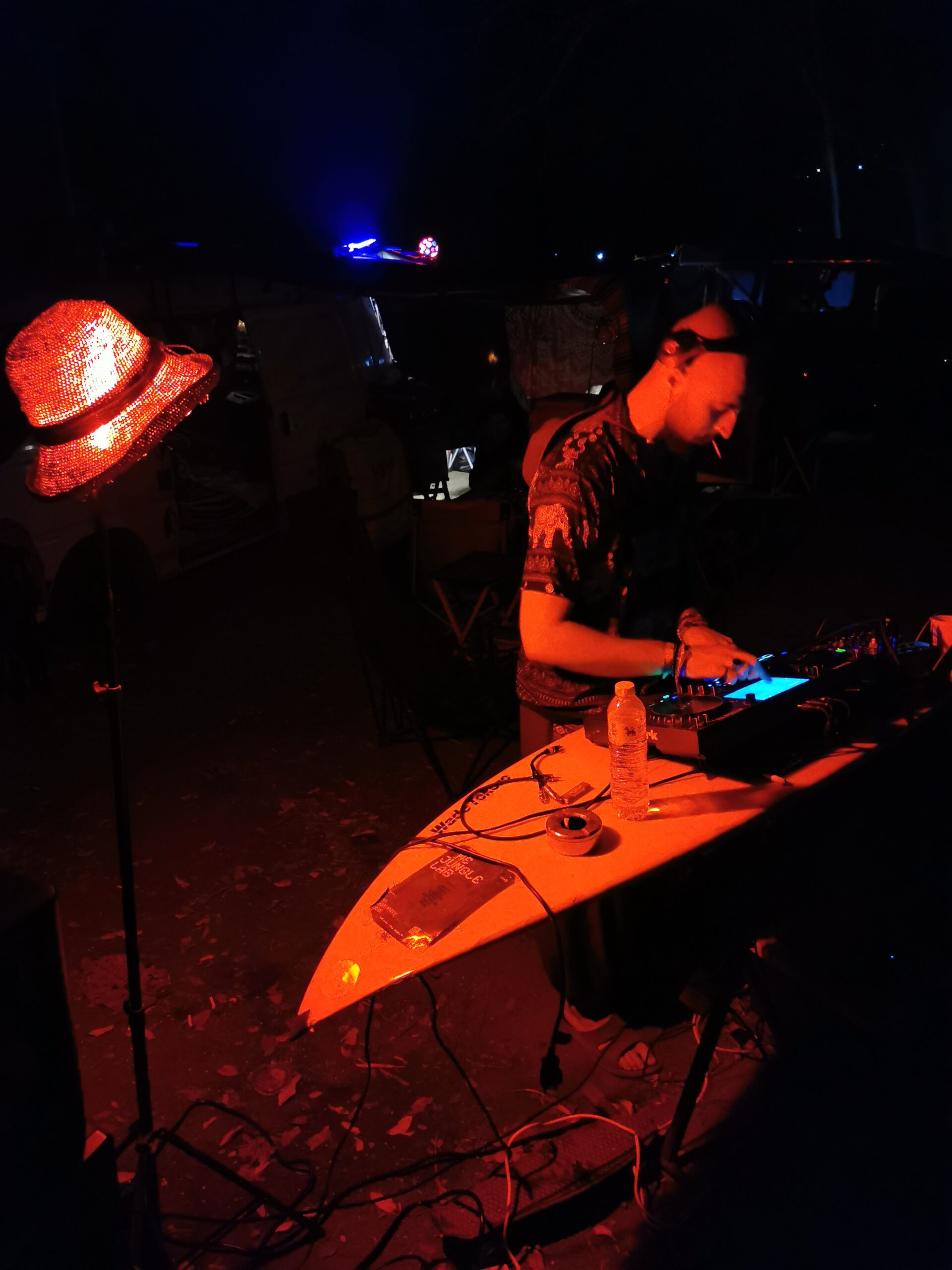 Après avoir hésité un long moment, je suis RAVI d’être resté un peu plus longtemps en Thaïlande pour assister à ce festival merveilleux!!!! Festival organisé depuis 2010 par des hippies japonais sur un site vraiment magnifique dans les montagnes de Chiang Dao. Avec Arnaud et Laurence nous rencontrons Elisa et Mattheo, un couple de jeunes français trop mignons avec qui nous installons un abris en feuilles de bananes pour nous protéger du soleil et avec qui nous passons les cinq premiers jours du festival. Ces premiers jours nous profitons à fond des concerts le soir (que de la musique instrumentale, pas d’électro…), des ateliers en tout genre (thérapie sonore, yoga méditation, tantra, danse…) et j’organise des ateliers “Créez votre propre bijou” qui fonctionnent super bien. Et je refait du jonglage de feu pour la première fois depuis plus de quinze ans!!!! Le cinquième jour c’est pause musicale et c’est l’occasion idéale pour nous prélasser au bord de la rivière à l’ombre des arbres (tous plus beaux les uns que les autres!), pour nous baigner dans les sources chaudes et pour nous reposer un peu. Et les cinq derniers jours se passent sans embûche mais avec une énergie plus calme. Après avoir discuté avec des DJ en dehors du festival, Arnaud nous fait un set électro d’une heure et demi sur lequel je me régale (ça m’a un peu manqué de taper du pied…). Et c’est là que nous rencontrons Orlane et Angie, un couple de parisiennes adorables avec qui le courant passe tout de suite! C’est grâce à elles que nous rencontrons ensuite Minh, une nana en or, son fils Alex et sa chèrie Bella. Minh a 75 ans mais elle en paraît à peine 55, elle a une pêche d’enfer et nous raconte sa vie pleine de rebondissements et d’aventure, une vraie inspiration pour le futur!!!!! Si ce festival durait un mois je pense que je n’en bougerais pas!!!!