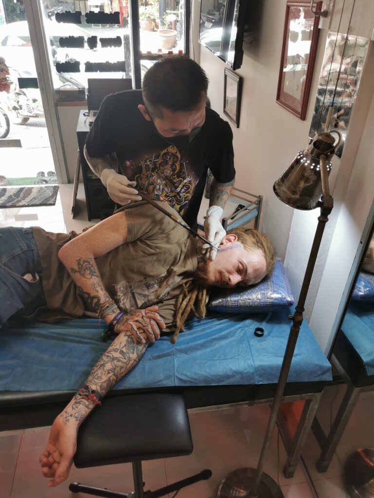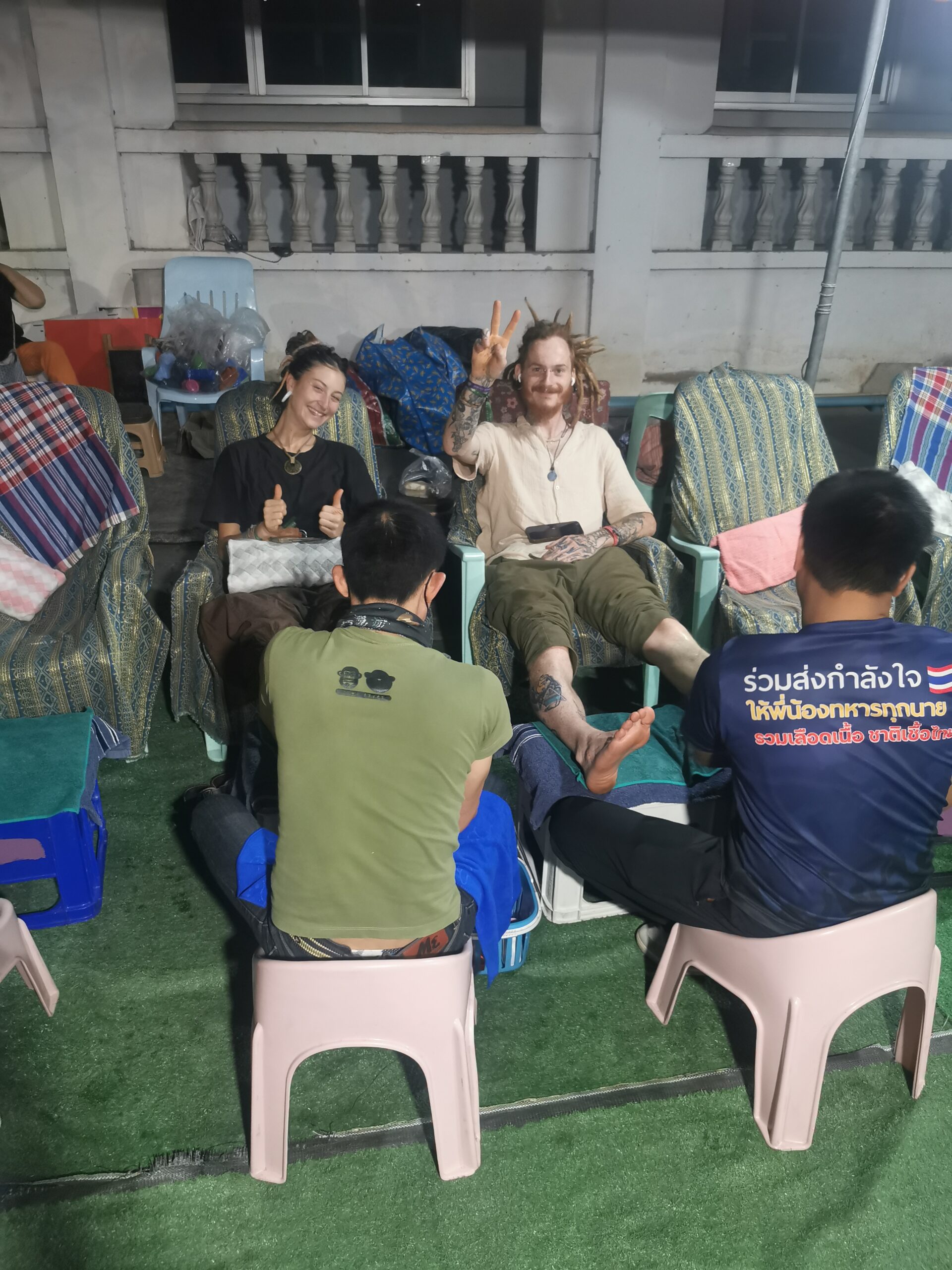 Après Shambalha festival, nous repassons par Chiang Mai avec Arnaud, Angie et Orlane et nous y retrouvons Élisa et Mattheo (qui s’y fait tatouer l’oreille!). On s’y fait masser, faire un soin du visage, j’y mange à nouveau de la cuisse de porc délicieuse cuite pendant des heures et nous allons à Chinatown pour le nouvel an chinois.
