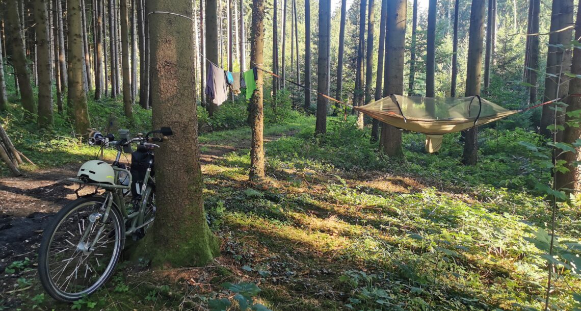 Grosse étape aujourd’hui (100km) pour me rapprocher rapidement de Salzburg où je rejoins Philippe, un ami psycliste (cycliste qui va en festival psytrance) rencontré au Boom festival en 2023 et sa chérie Betta. Après un petit plouf dans le lac de Chiemsee (See = lac en allemand), je suis allé me doucher dans un camping puis me suis trouvé un petit coin de forêt perdu pour suspendre mon hamac pour la nuit. J’ai béni mon nouveau hamac avec moustiquaire car il y avait des centaines de moustiques qui ne rêvaient que de mon sang (je les narguais à travers le filet hihihi!!!)!